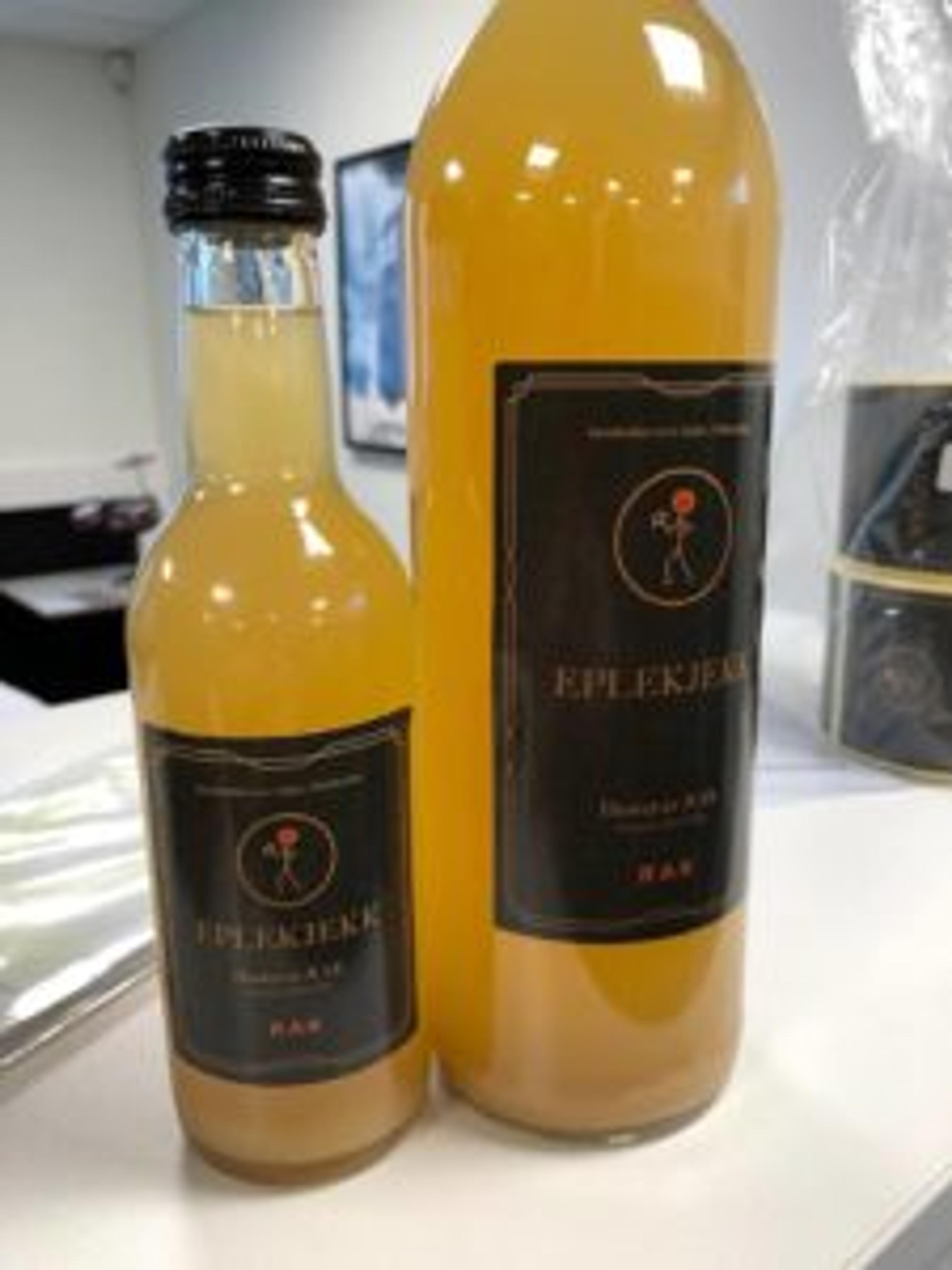 KLARE FOR SALG: Årets Eplekjekk er klar, akkurat i tide til Førjulsmarked på Olgars lørdag 17. november. Ditt grafisk på Revetal har stått for nytt design på flaskene i år. Foto: Privat.
