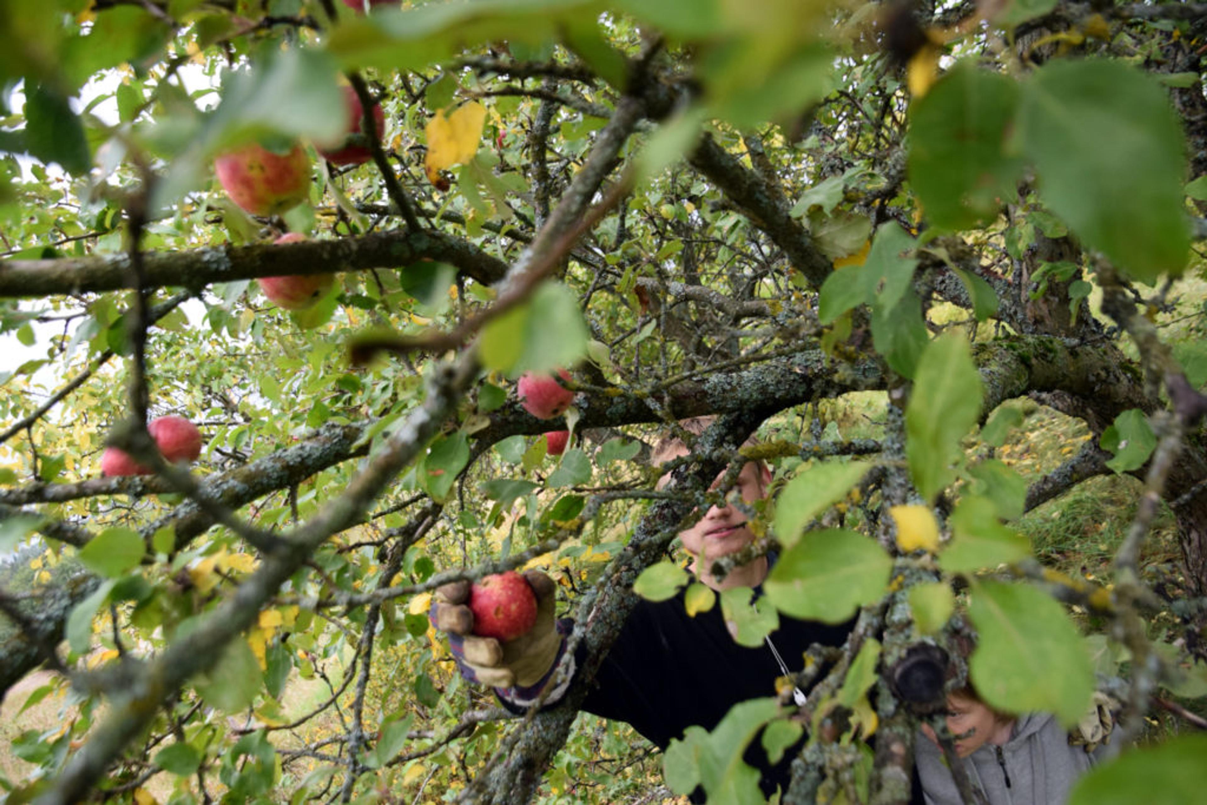 Alle slags epler blir plukka og sendt til pressing i Moss. Det gir en helt særegen smak: «Smaken av Re-eplehager». To plukkelag var i gang, og de kaller seg A- og B-gjengen.