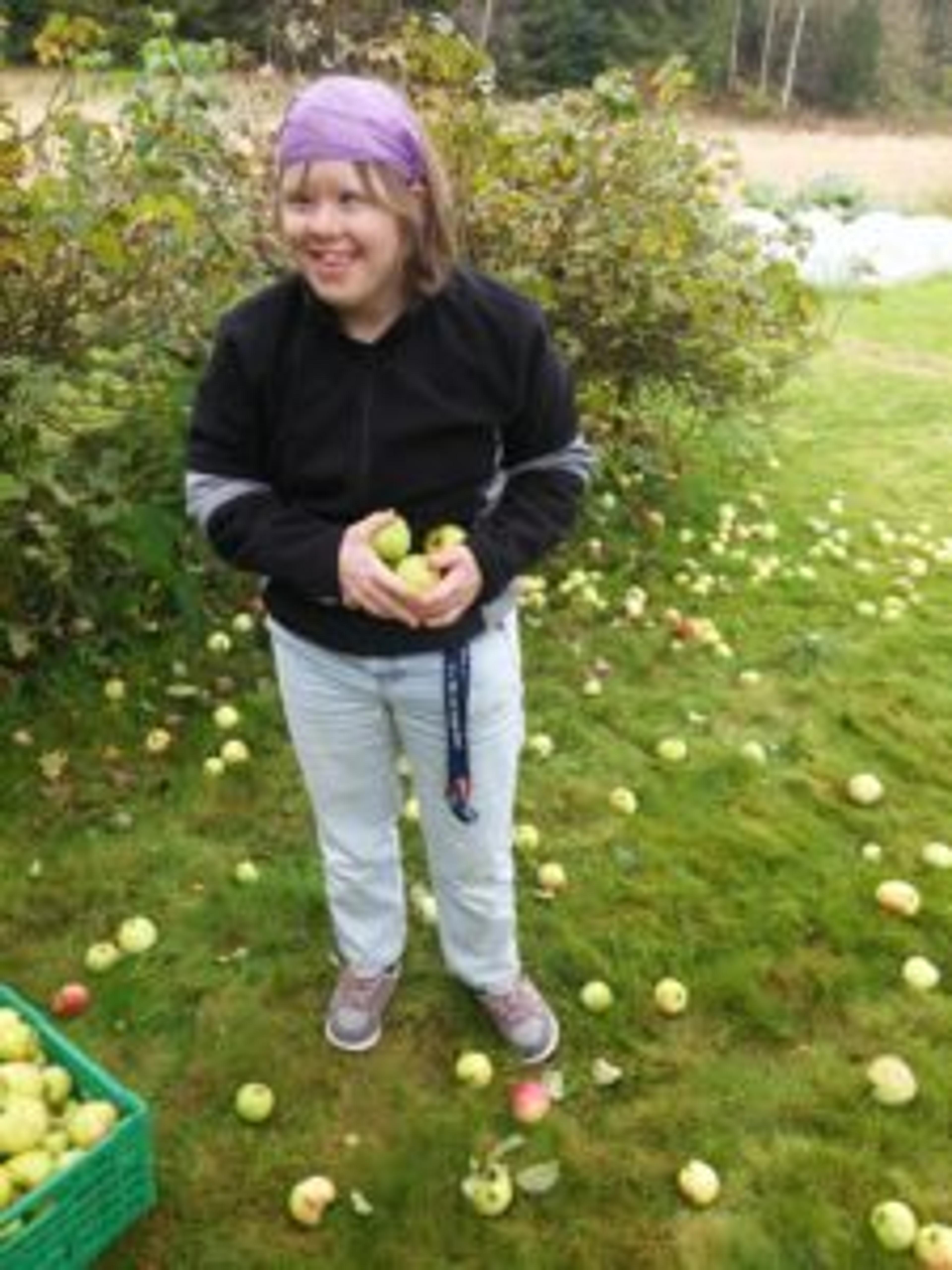 FIN HØSTTRADISJON: Linn Jeanette liker å jobbe ute og plukke epler om høsten. Og det hender hun spiser et eple som jobbmat underveis. Foto: Stian Ormestad.