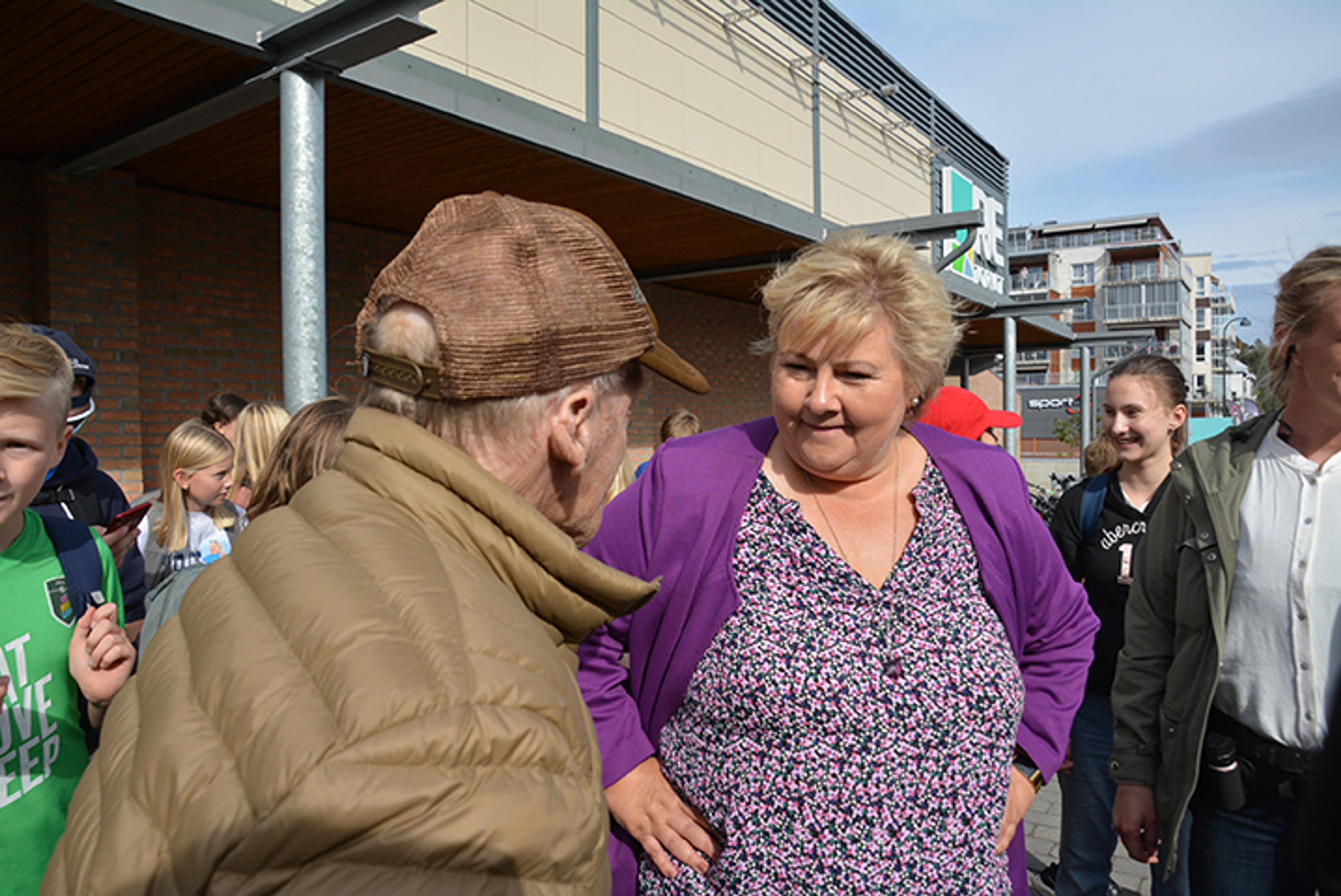I PRAT MED STATSMINISTEREN: Erling hadde noen alvorsord til daværende statsminister Erna Solberg, da hun kom med valgkampbussen til Revetal. Sjøl har han alltid sympatisert mest med sentrum i norsk politikk, først Senterpartiet, så KrF. Arkivfoto: Stian Ormestad, ReAvisa.