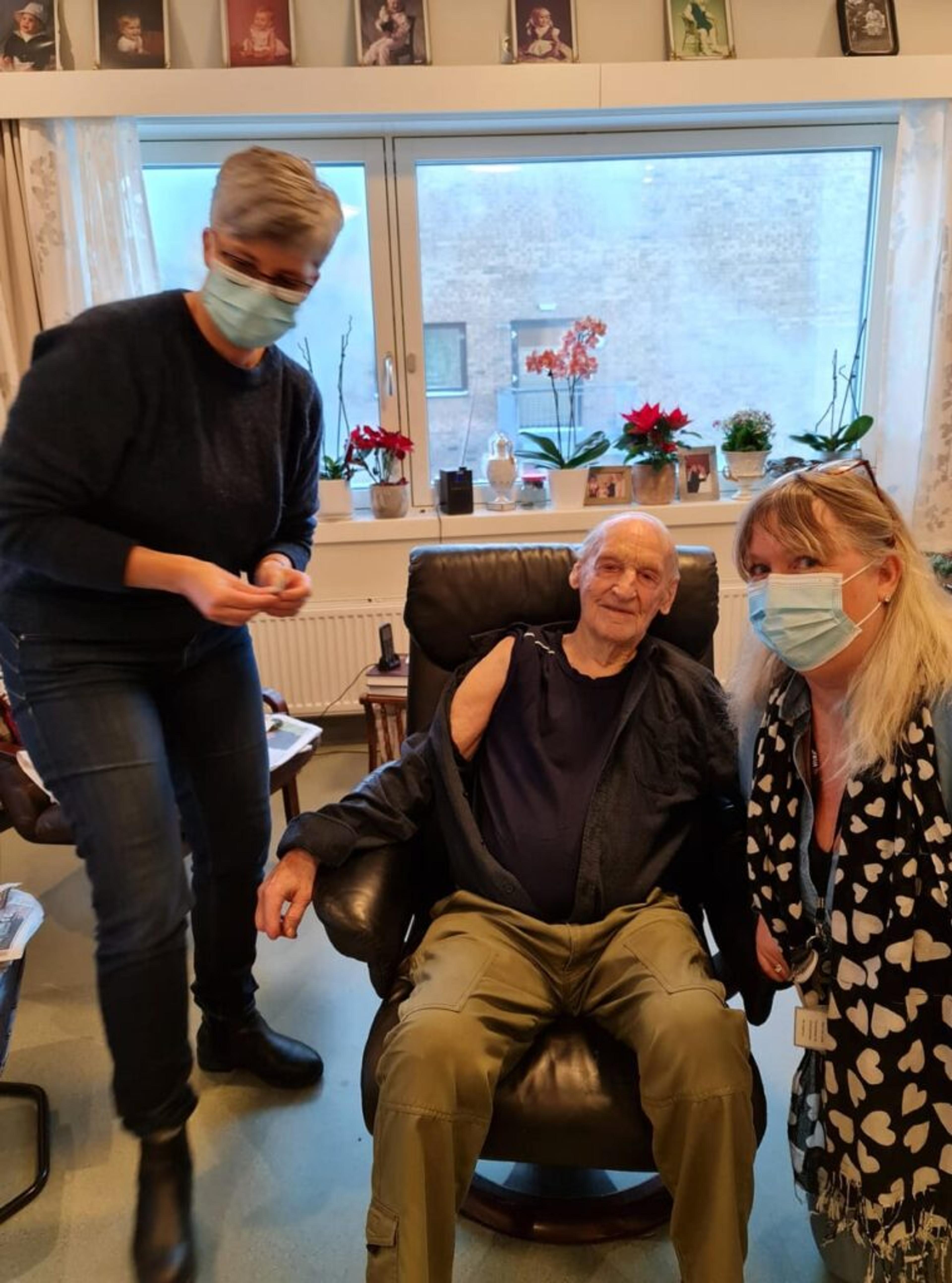 FØRST UTE: Erling var en pioner mange ganger i livet sitt, også som snart 100-åring da koronavaksinen kom til Re helsehus. Da fikk han vaksine, som den aller første på avdelingen. Arkivfoto: Re helsehus.