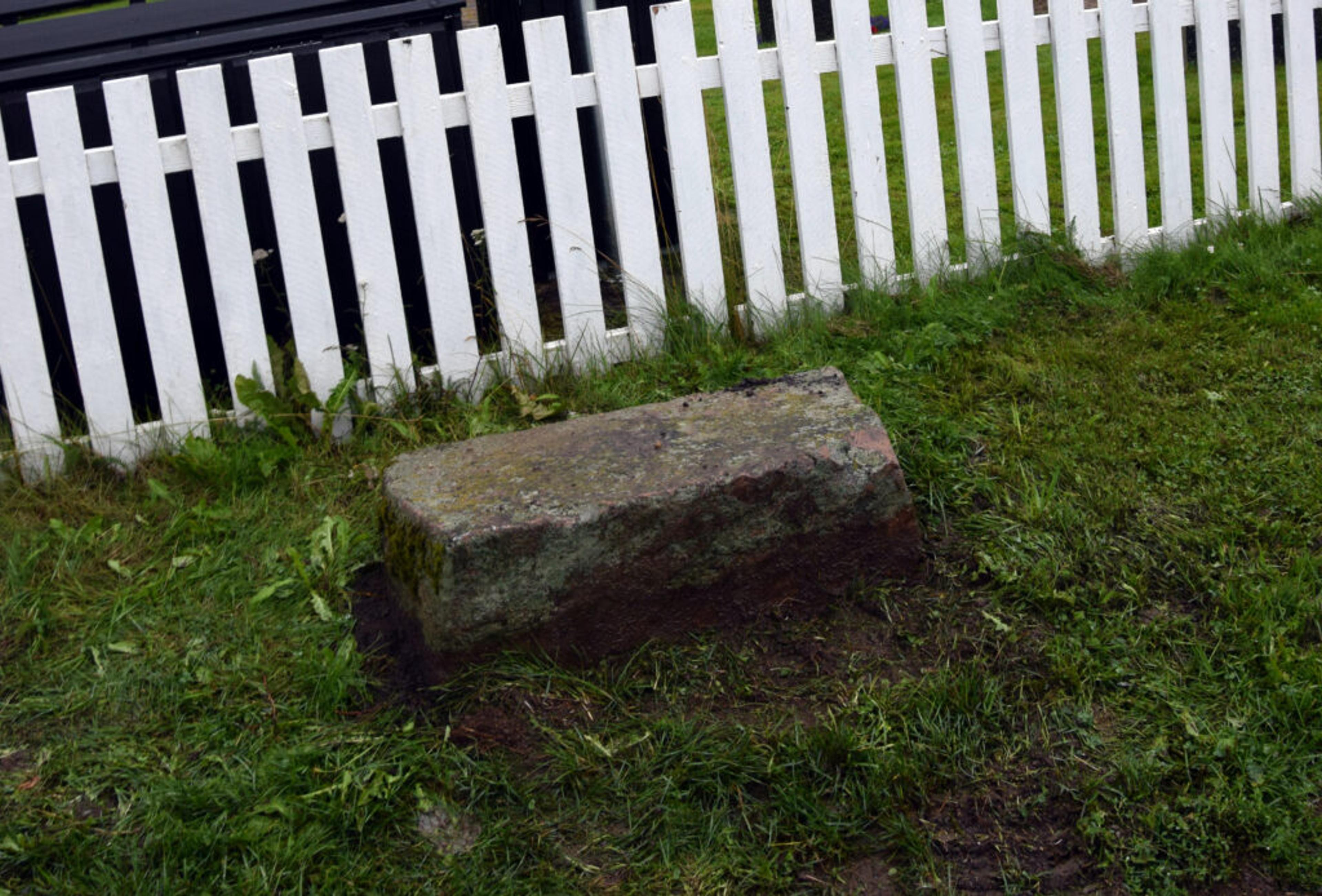 ReAvisa har vært ved Ramnes kirke og tatt bilde av steinen som er lagt tilbake utafor kirkegårdsgjerdet.