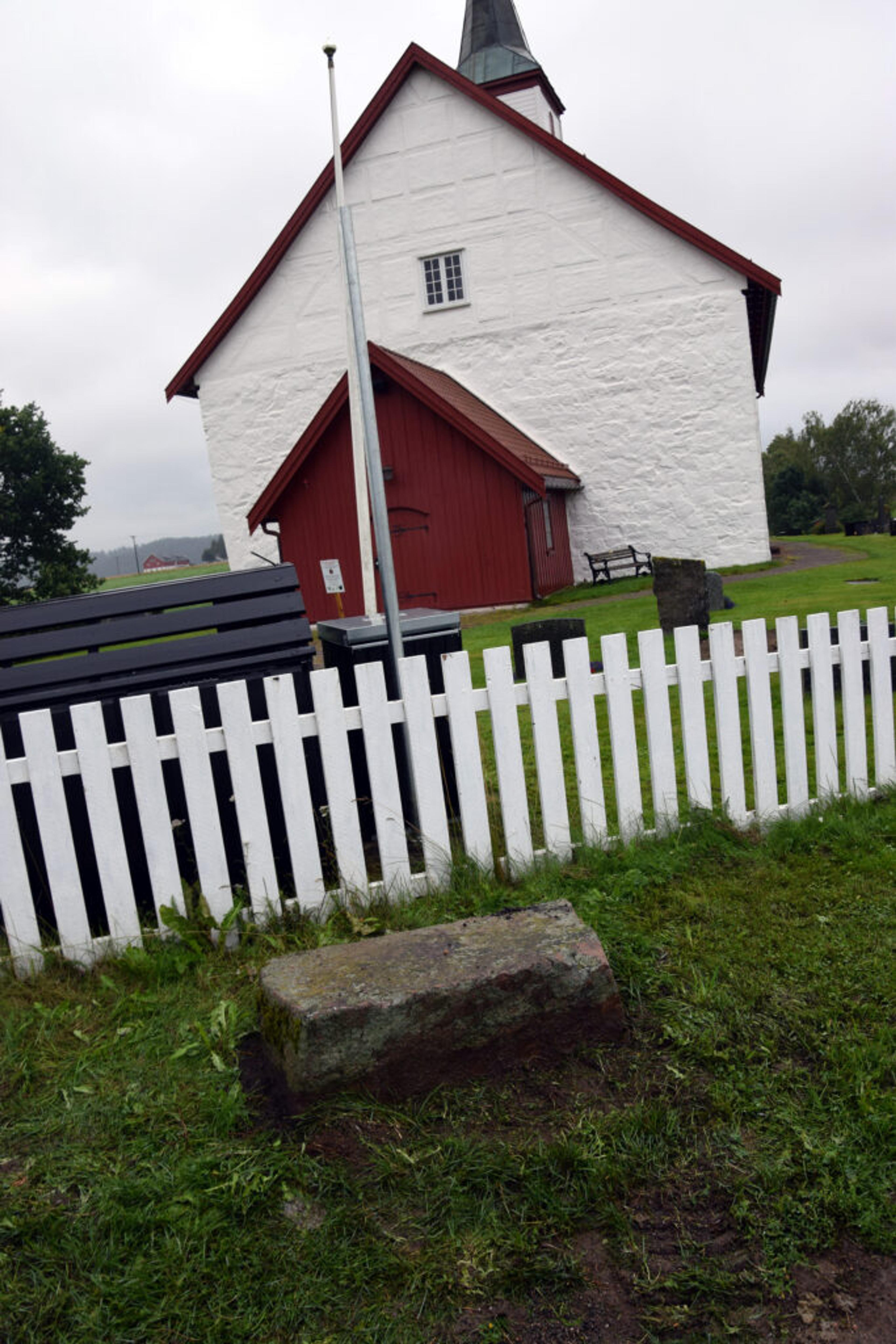 Men steinen må ligge der. Alle kirker skal ha en sånn stein. Den er listeført, som alt annet i og rundt kirka, hos Riksantikvaren.