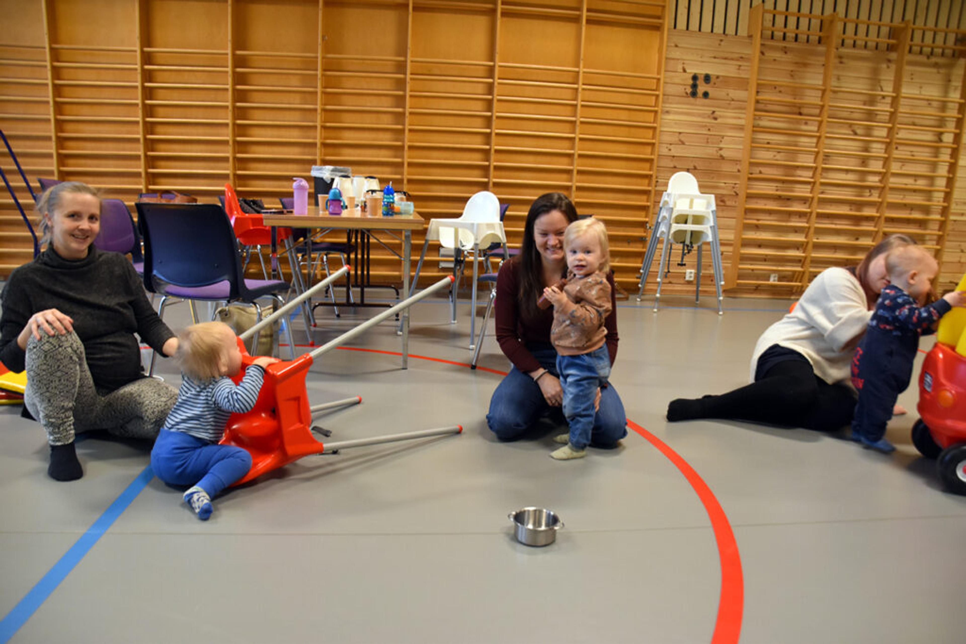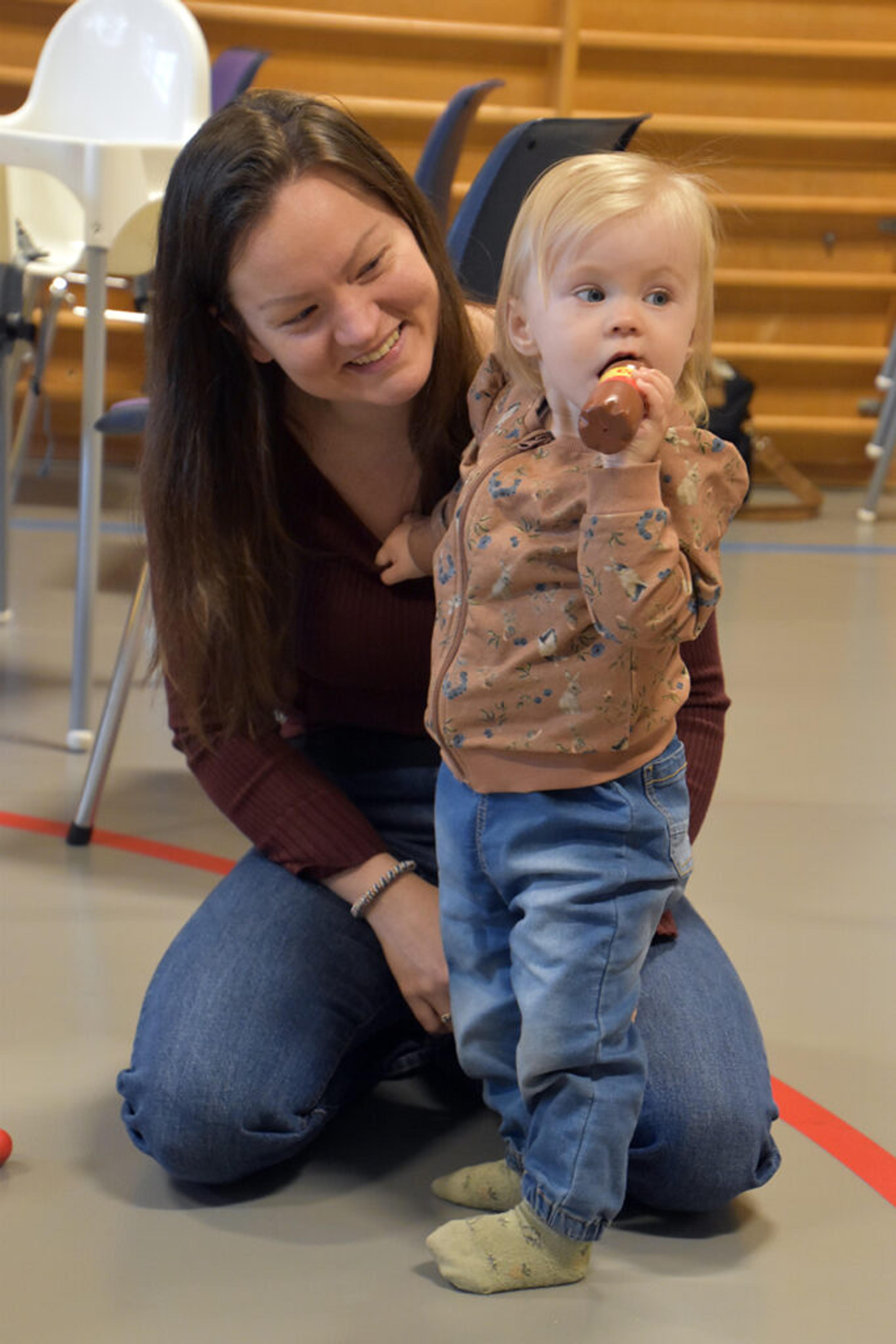 Hun flytta fra Bergen og har etablert seg med mann og barn her i Re. Uten åpen barnehage ville det vært vanskelig å komme til et nytt sted. Milli Katrine (1) leker på mattene i gymsalen med nye venner.