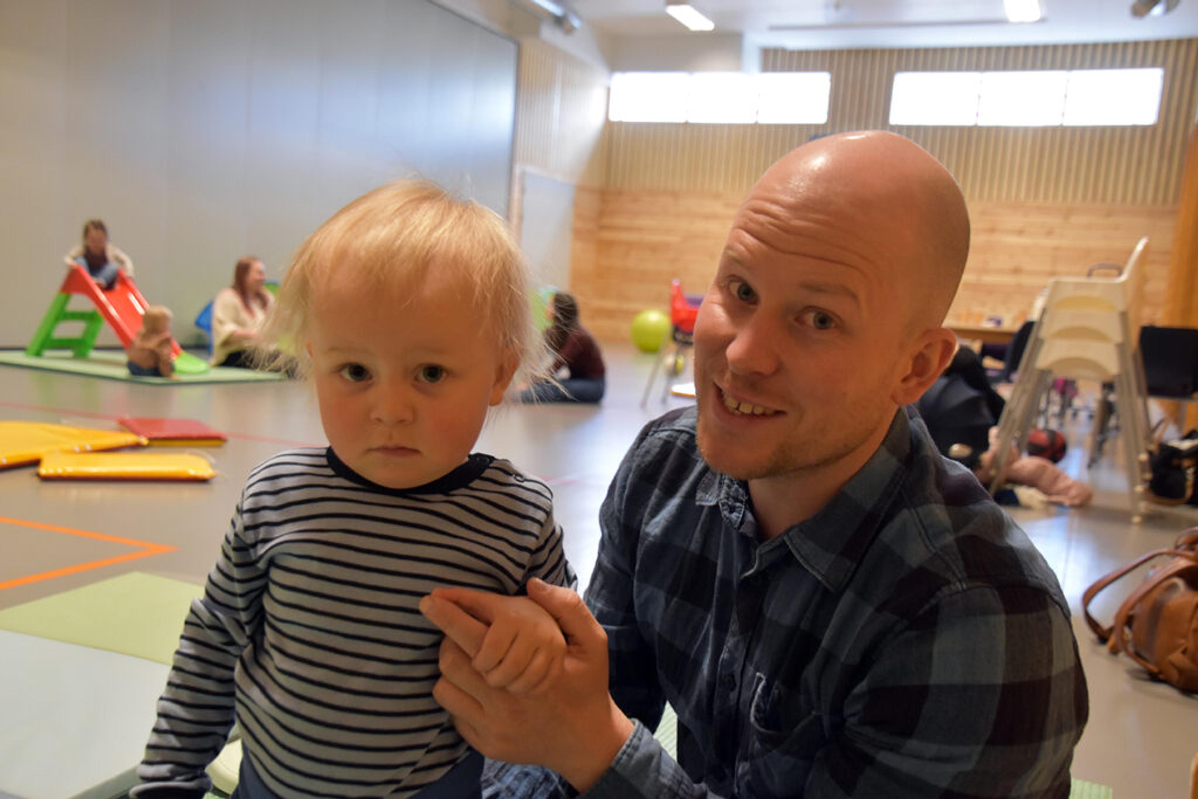 STABLER PÅ PLASS: Aron Emilian (1 1/2) bygger et lite tårn av kopper og kar sammen med pappa. De trives begge veldig godt på Åpen barnehage i Undrumsdal. Foto: Stian Ormestad.