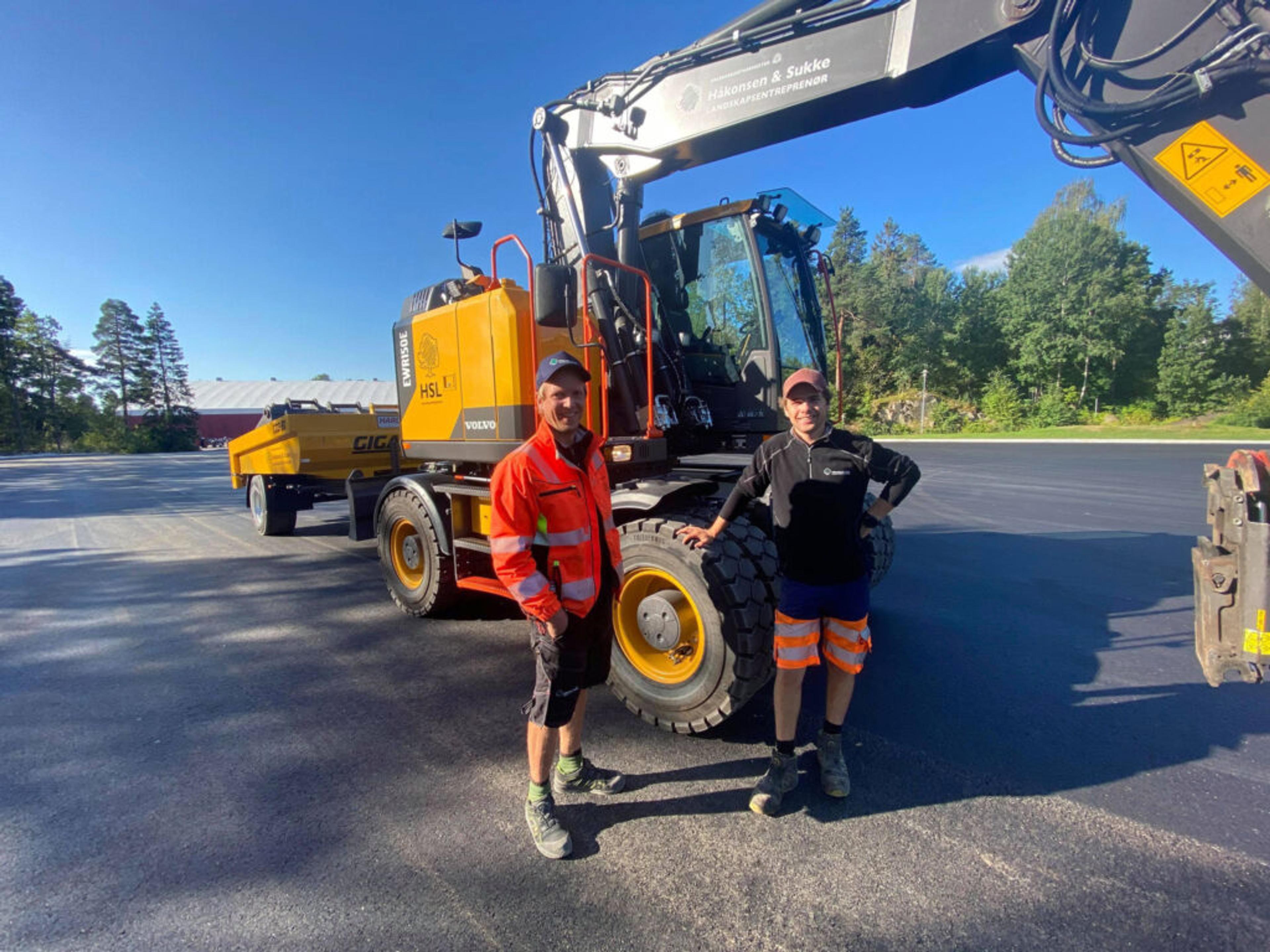 FÅR JOBBEN GJORT: En av entreprenørene på jobben er Håkonsen og Sukke landskapsentreprenør, her ved anleggsleder Audun Meum Tvetene og maskinfører Christian Hobæk. Foto: Stian Ormestad.