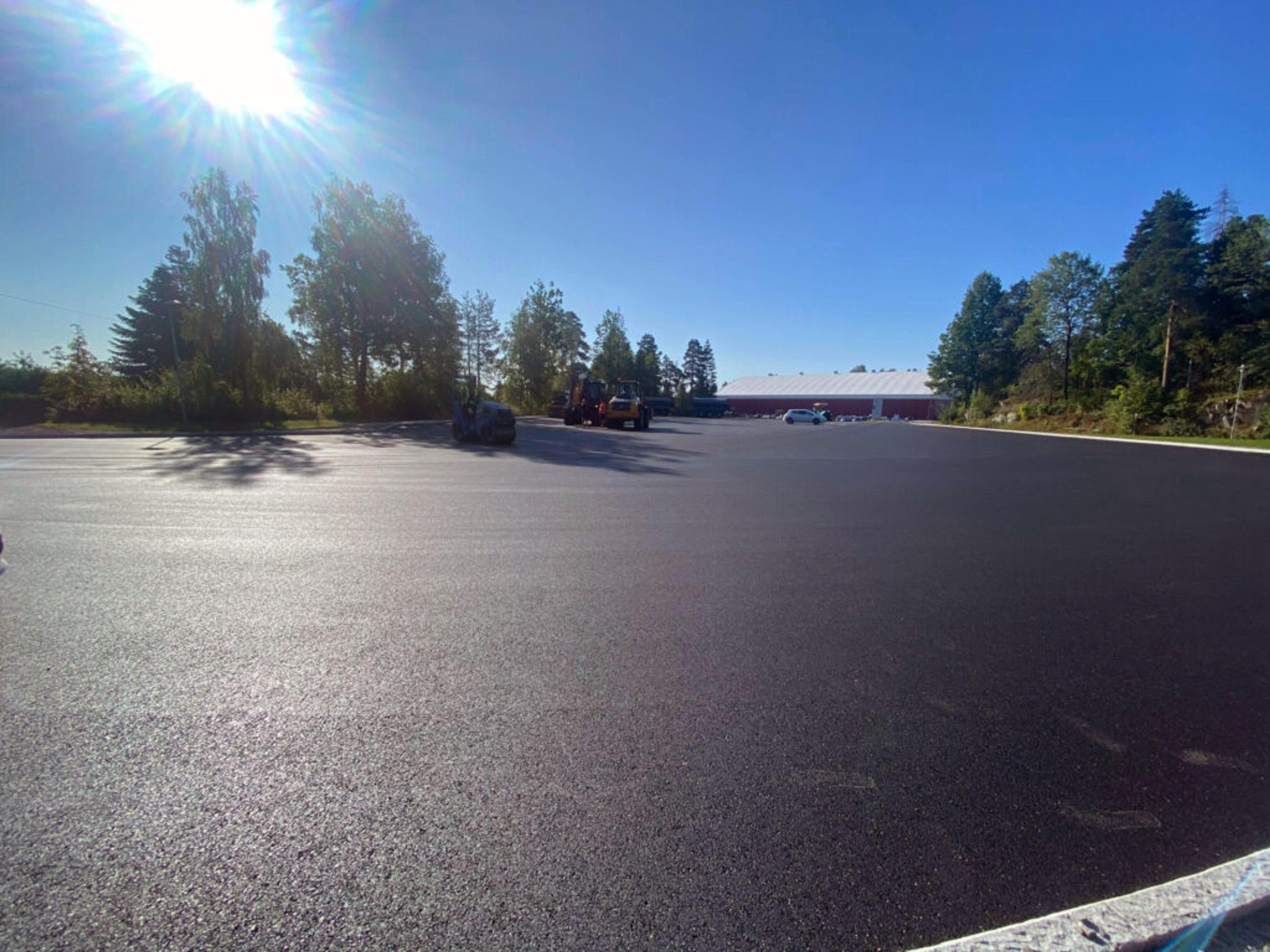 Nå blir det ny asfalt merka opp med busstopp, parkeringsplasser og kjørefiler.