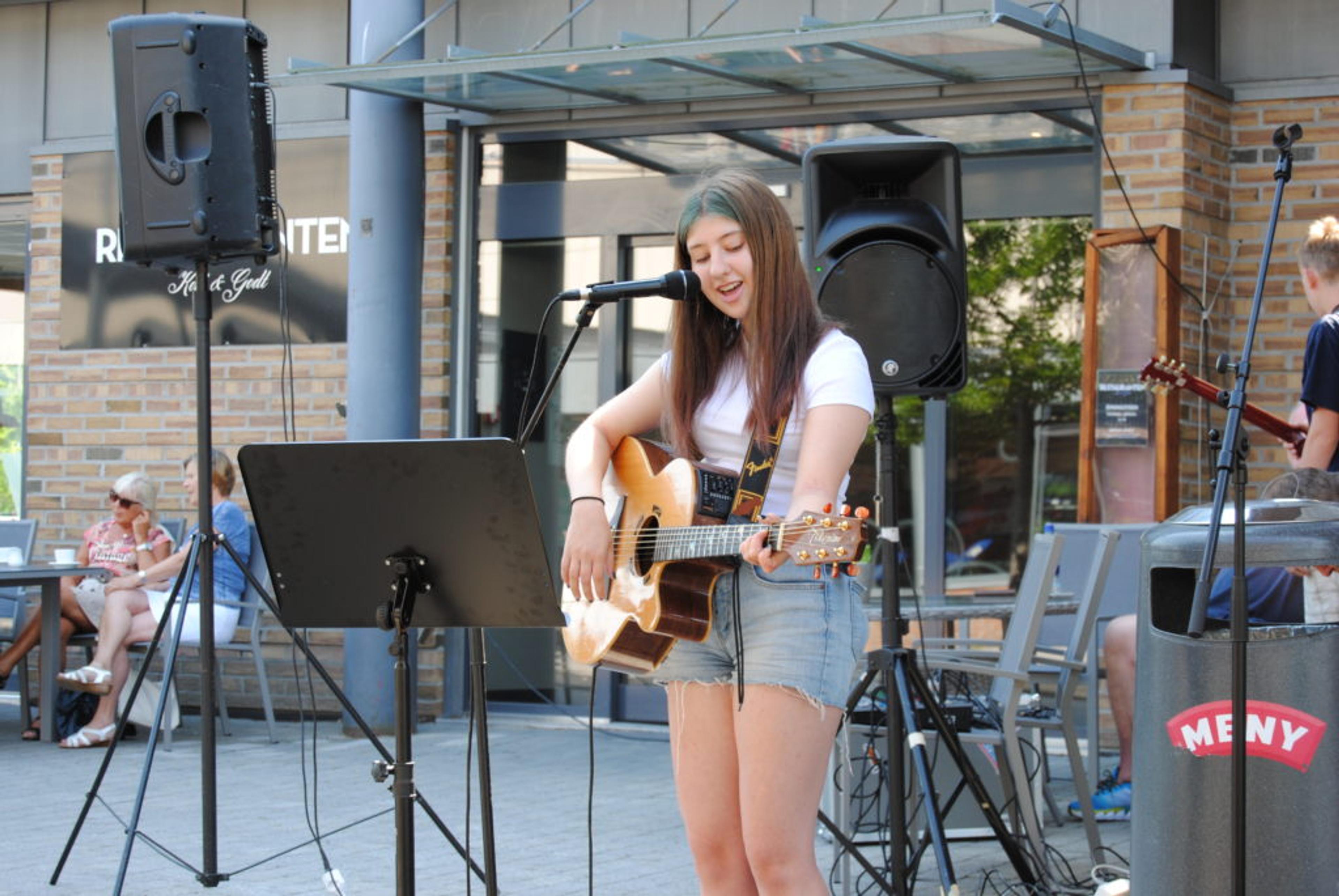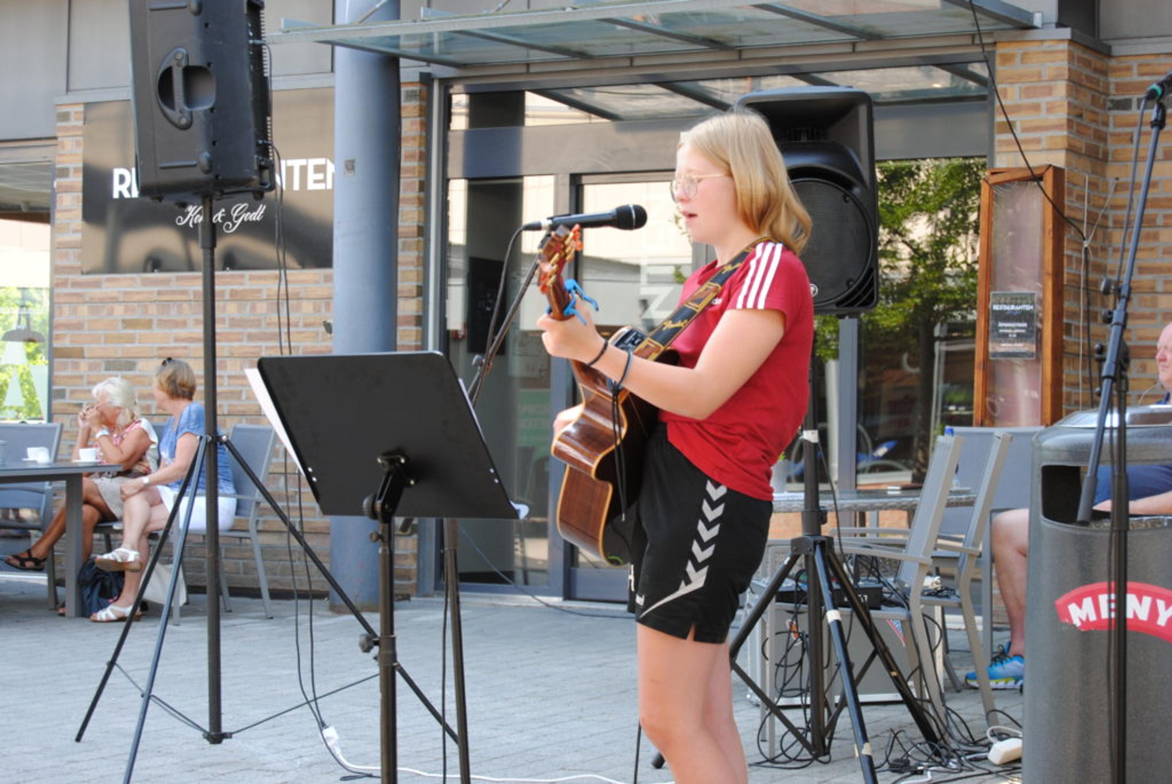 Benedicte Brudvik spiller og synger aleine på Re-torvet-scenen. Foto: Lykke Amelie Amundsen.