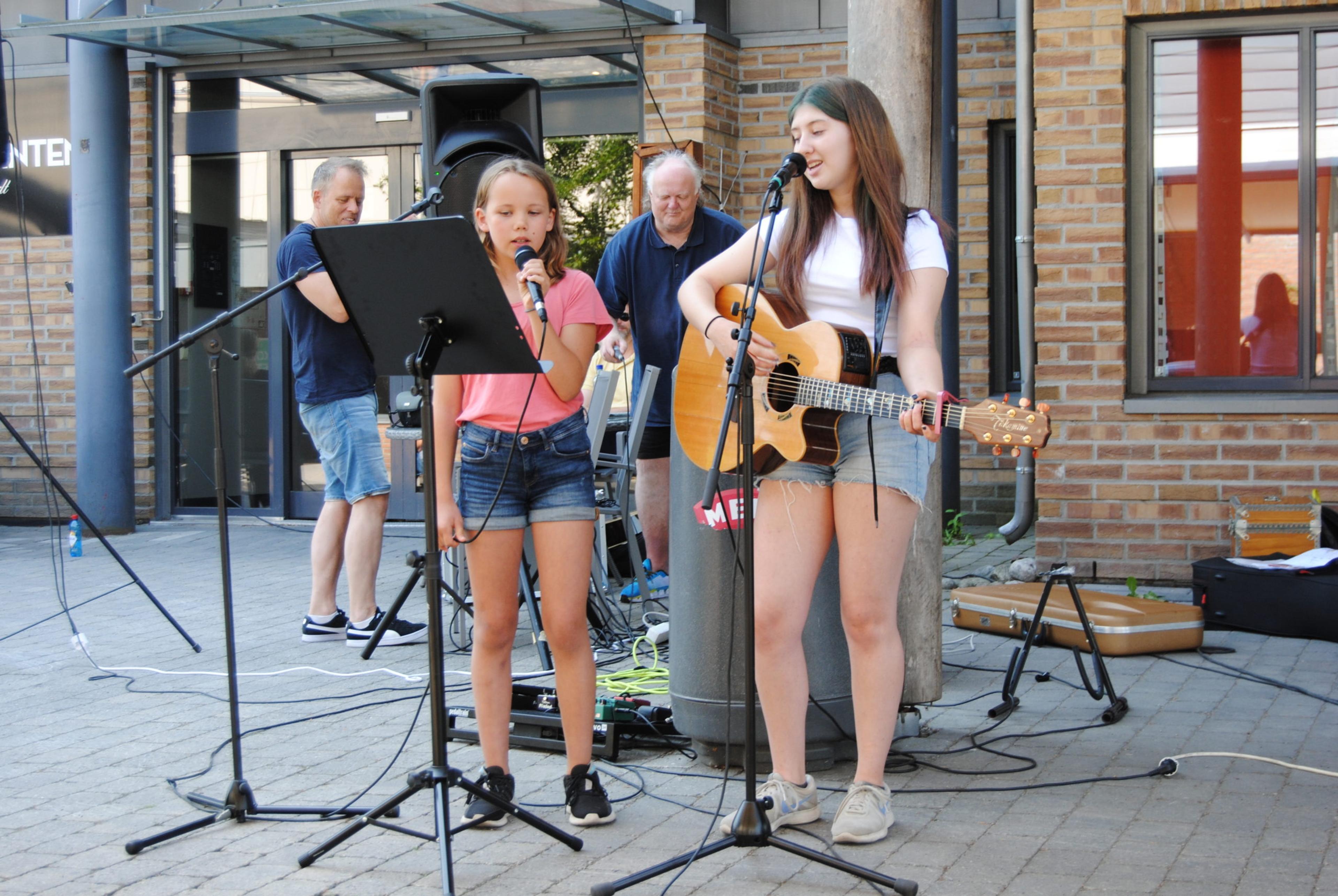 Mathilde Skjeggestad og Benedicte Brudvik synger og spiller sammen. I bakgrunn ser vi Revetal ungdomsskole-musikklærerne Frank Wedde og Tom Hansen styre lyden. Foto: Lykke Amelie Amundsen.