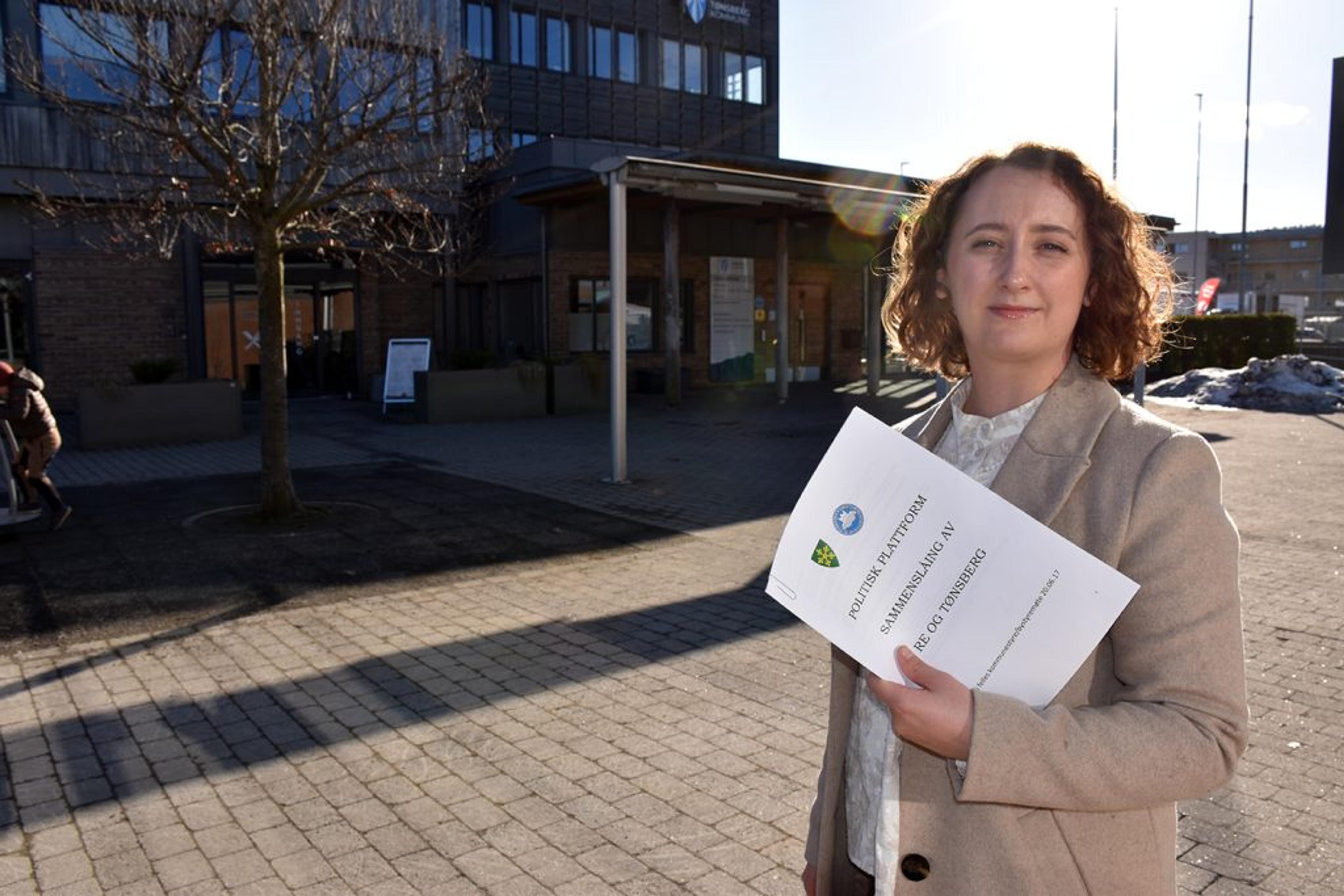 POLITISK PLATTFORM: Karoline Lie (28) mener vi må respektere den politiske plattformen som ble utarbeida gjennom folkemøter og fellesnemnd og som lå til grunn for sammenslåinga mellom Re og Tønsberg. Flere punkt står til stryk, mener hun – fem år etter sammenslåing. Foto: Stian Ormestad, ReAvisa.