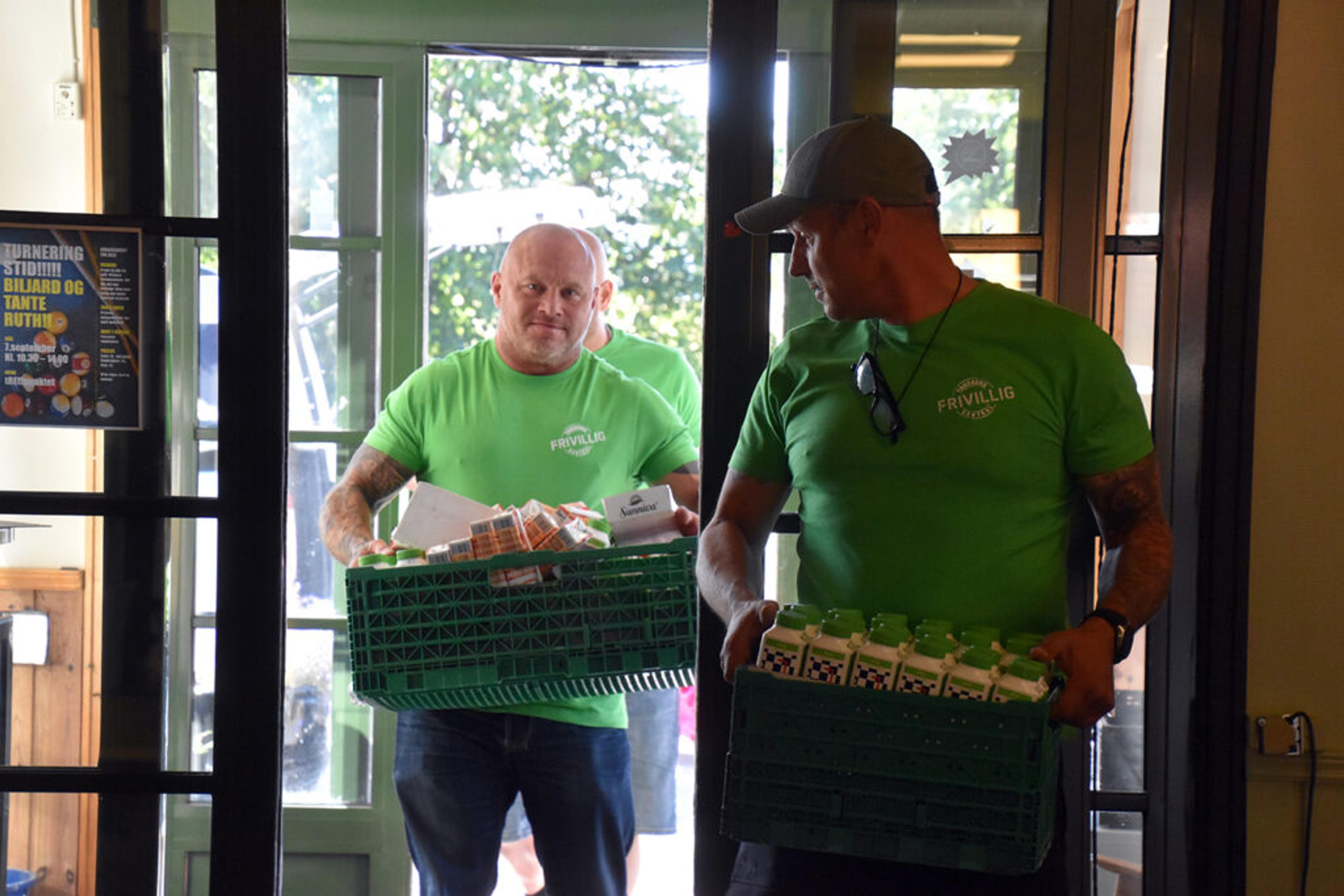 MATKASSE PÅ MATKASSE: De frivillige på tREffpunktet bærer inn dagens leveranse fra Matsentralen, med frivilligleder Torbjørn Brunstøl i spissen. Foto: Stian Ormestad, ReAvisa.