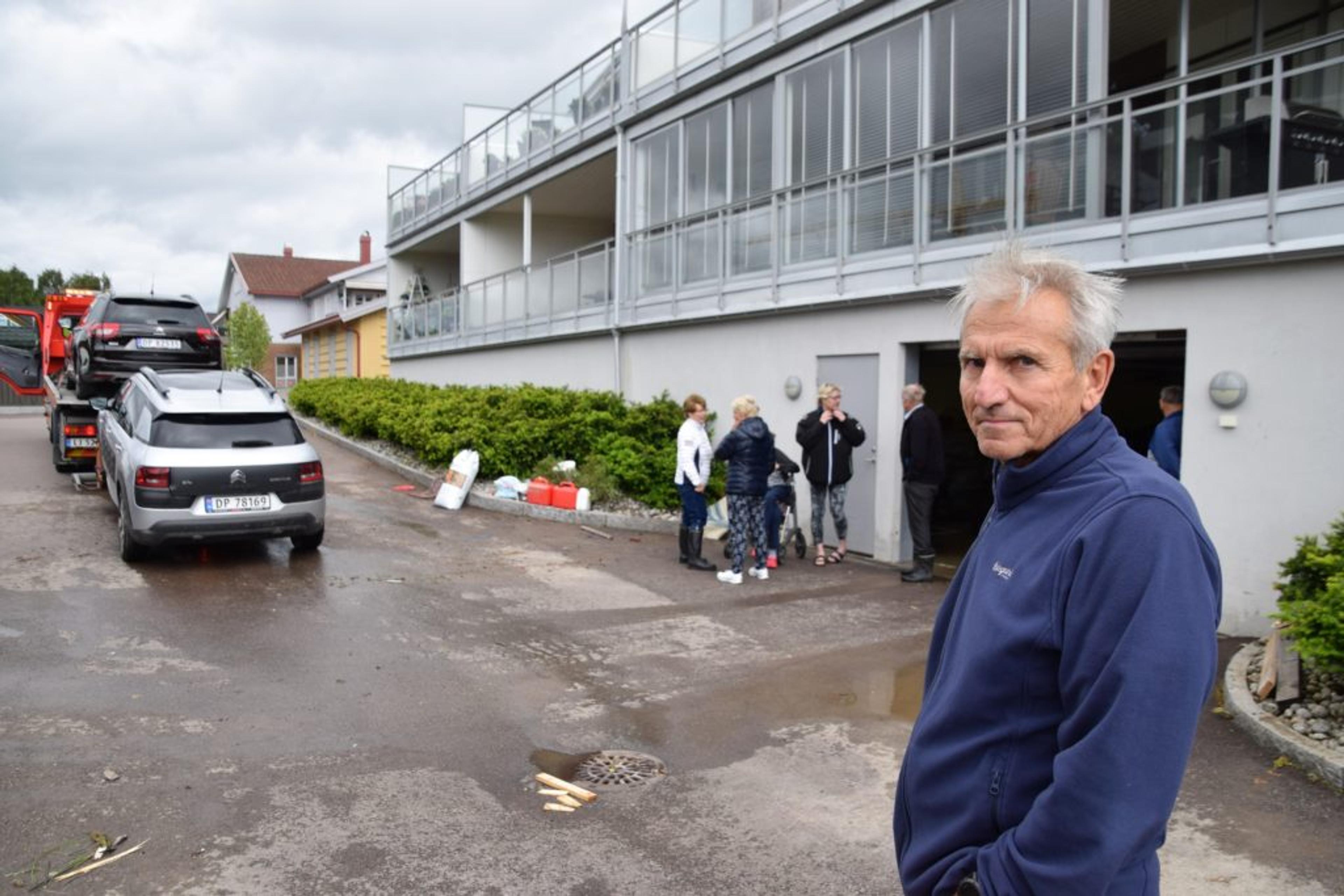 – Det må være noe med røra under her som ikke er på stell. Da det begynte å dra seg til, kom det vann opp av kummen ved utkjøringa for parkeringskjelleren, peker Alf Daniel.