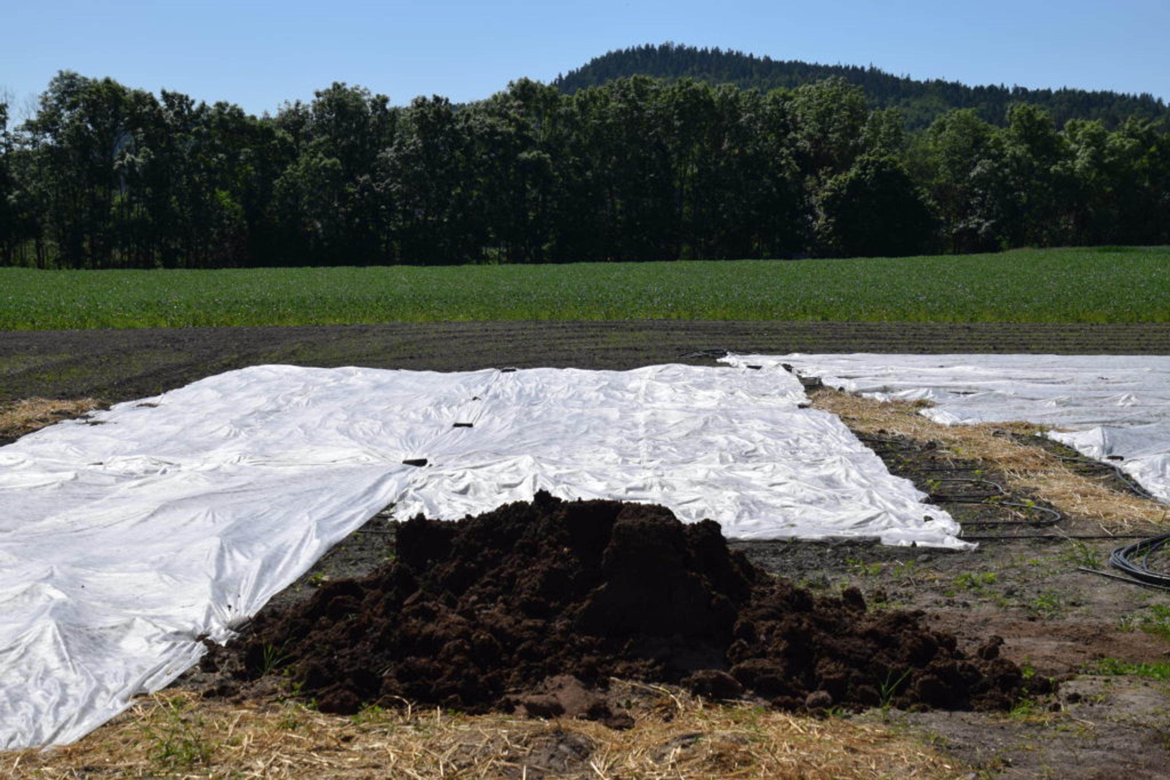 TRE FARGERIKE MÅL MED JORD: Her skal det blomstre i alle slags flotte farger i løpet av sommeren. Dette er første sesong med blomsterproduksjon på gården langs Tinghaugveien. Foto: Stian Ormestad.
