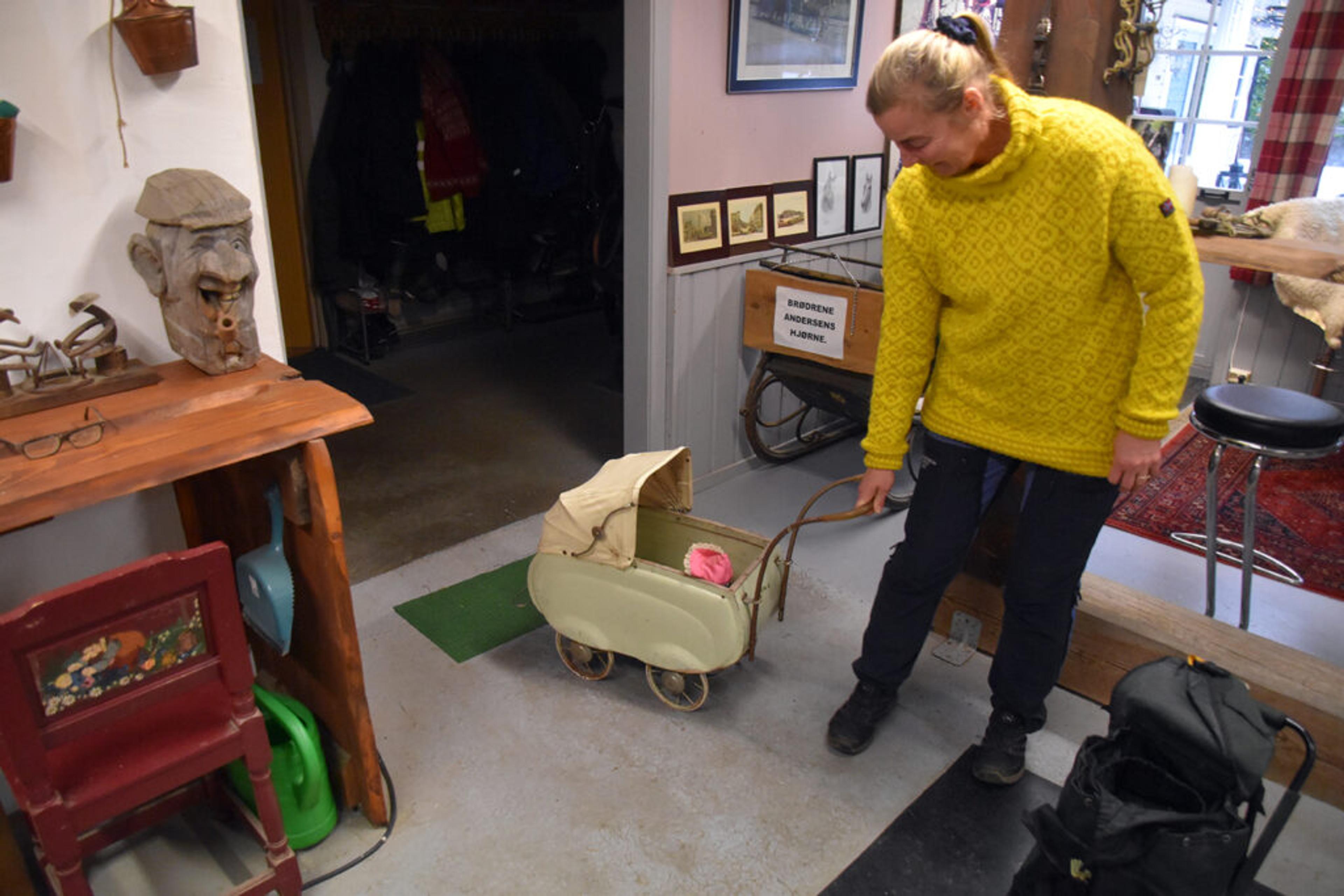 SAMLERE, BEGGE TO: Da Re-daktøren var innom, var denne gamle barnevogna et diskusjonstema: – Ho er ikkeno’ bedre enn meg, sier Roger om sin kjære kone: – Jeanette drar på dynga og kommer hjem med mer enn det hun hadde med. Foto: Stian Ormestad, ReAvisa.
