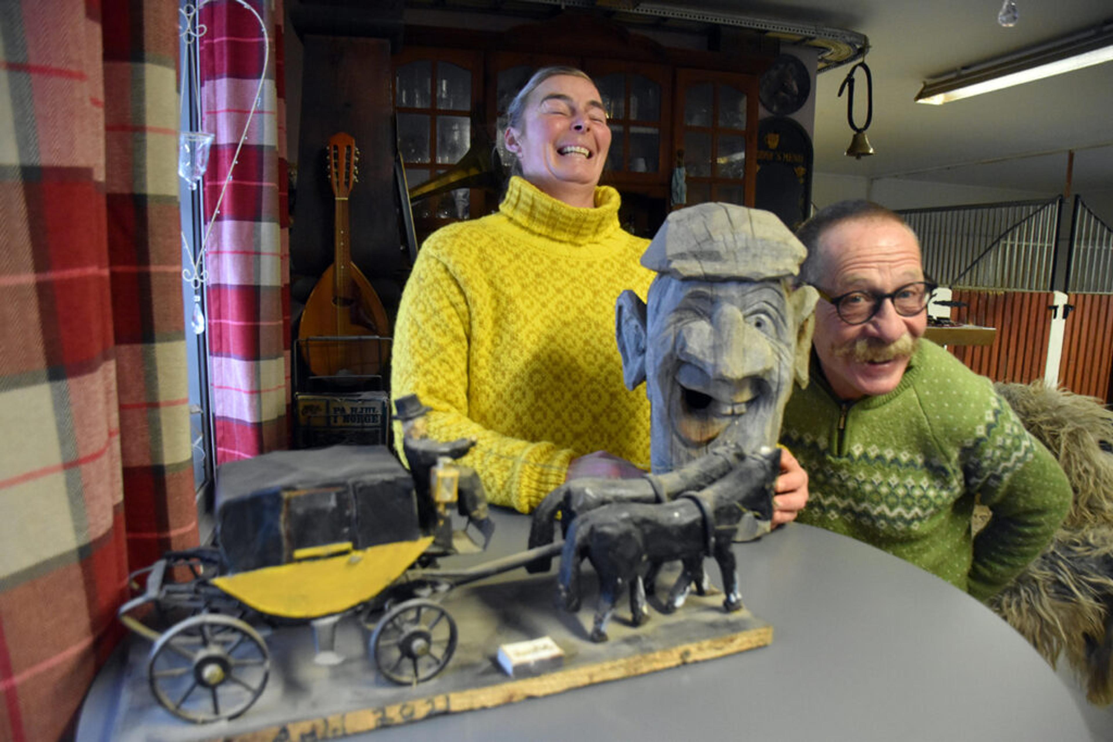 IKKE PLASS TIL MYE: – Alt skal selges, bortsett fra det vi får med i husbåten, men det er ikke mye – men vi må få med oss denna figuren her. Foto: Stian Ormestad, ReAvisa.