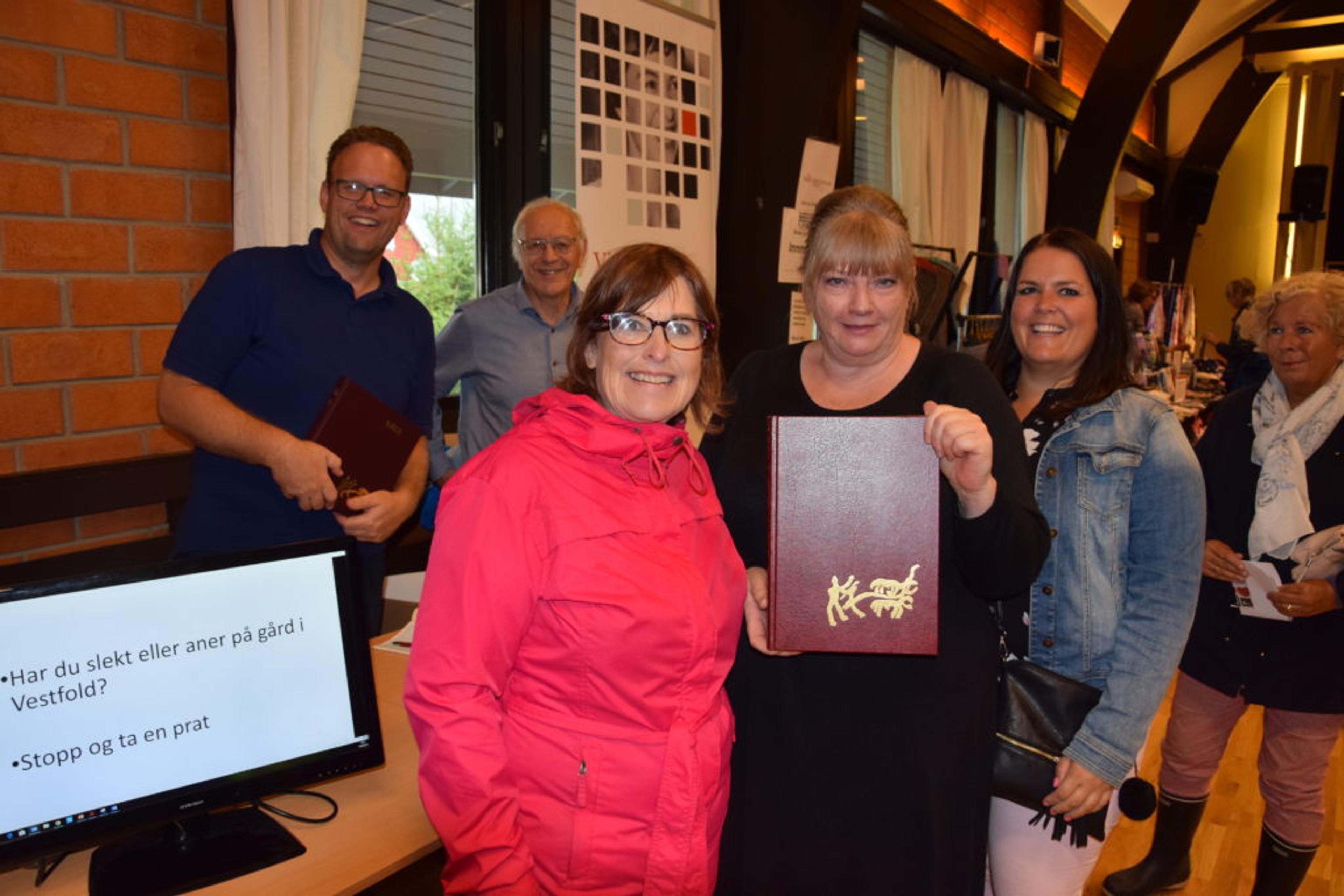 NORSKE GARDSBRUK: Mariam Ryan fra Minnesota, USA, har aner på gårder omtalt i Norske gardsbruk-serien. Vi ser også Hege Engerland Sommerstad fra Sande og Lene Engerland Sommerstad fra Drammen, og i bakgrunnen Lars Jørgen Ormestad og Svein Knut Granum fra forlaget bak bokserien. Foto: Håkon Westby.