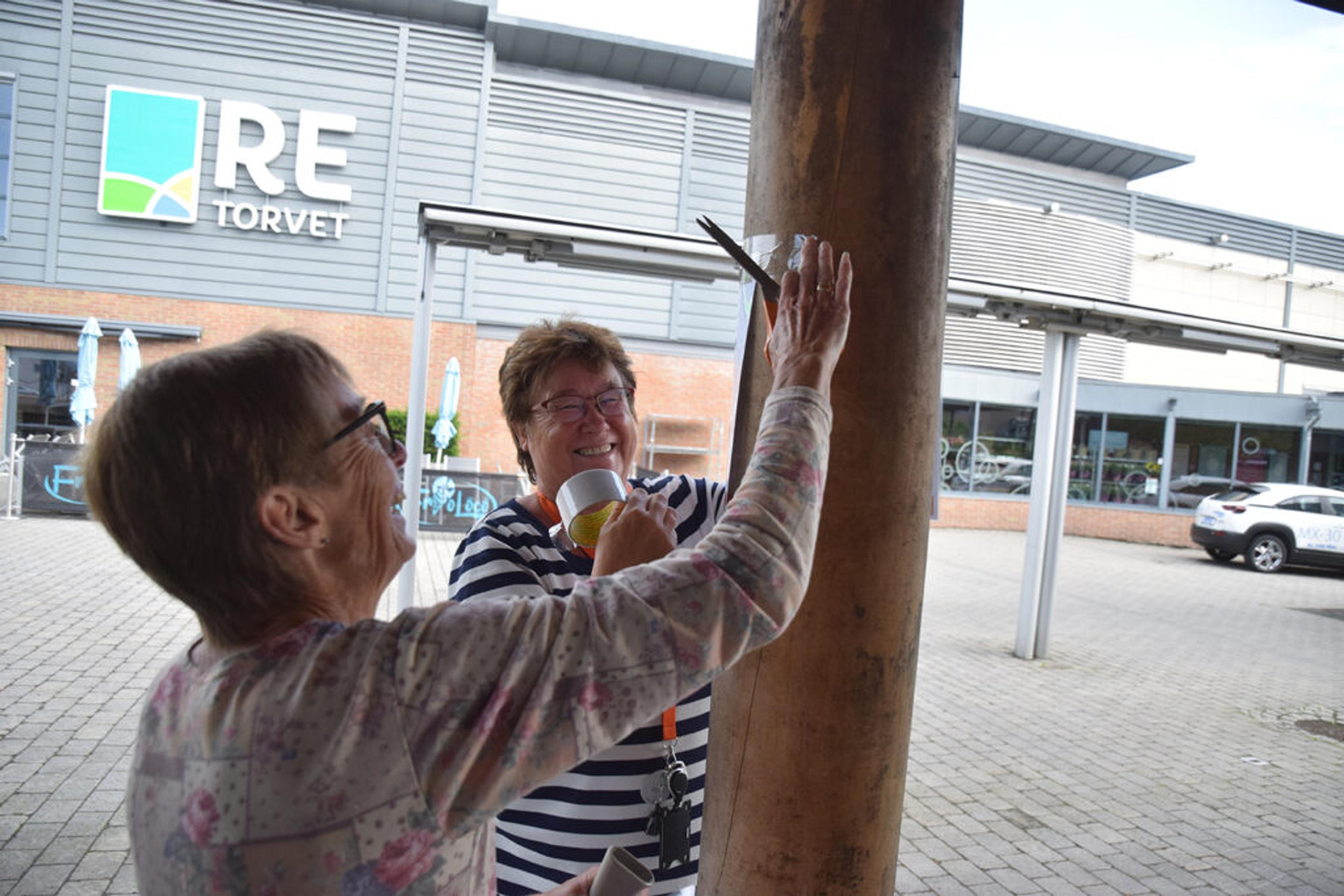 ALT PÅ STELL! Valgmedarbeider Synnøve Finnerud og ansvarlig for forhåndsstemming i Tønsberg kommune Lise Wåden Tandberg sørger for at plakater og piler kommer på plass i bygdebyen vår. Foto: Stian Ormestad.