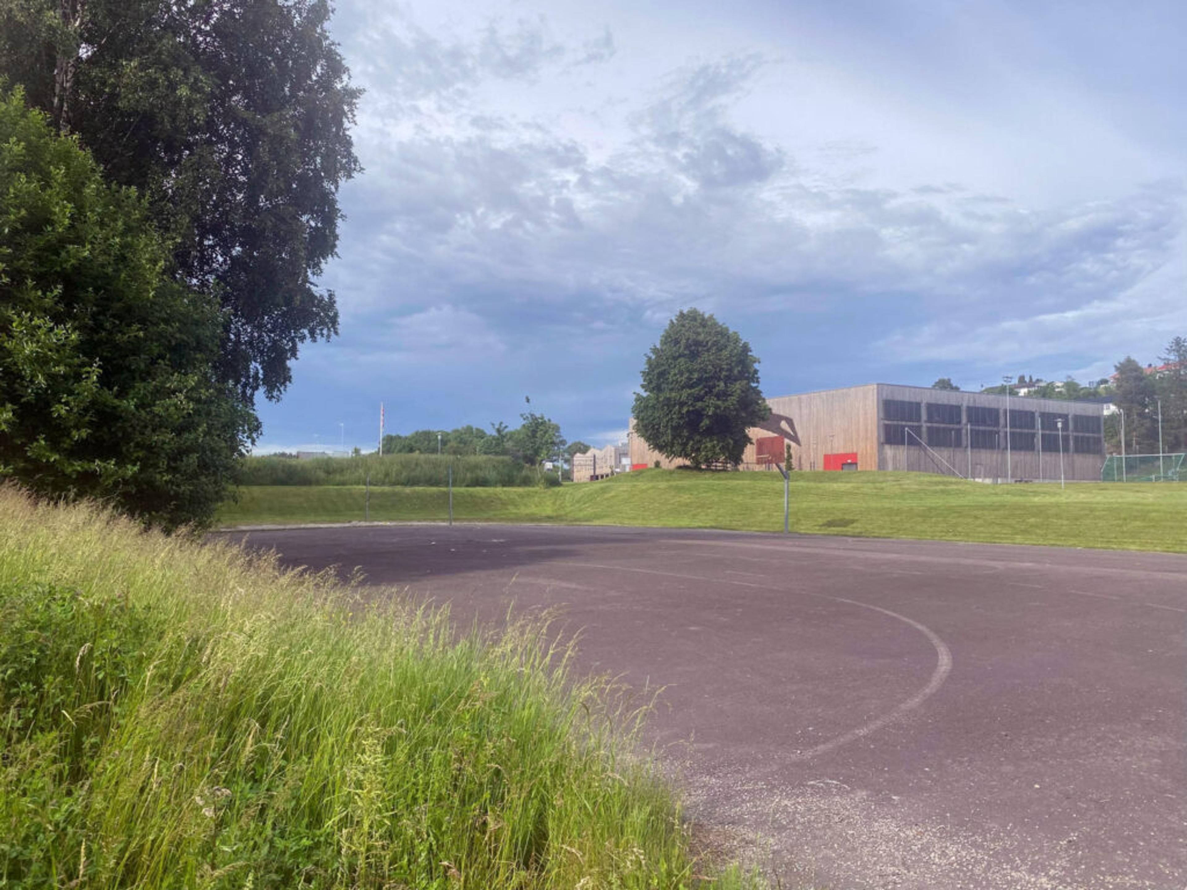 ALT KLART: Området fra gangstien ved Revetalhallen og ned til Skoleveien, og fra vollen bak til Kåpeveien, var vedtatt å bli til bygg og uteområde for ungdomshuset på Revetal. I dag er det en asfaltert bane her. Elever ved skolene i Re og Barne- og ungdomsrådet har vært hele veien i prosessen. Foto: Stian Ormestad, ReAvisa.