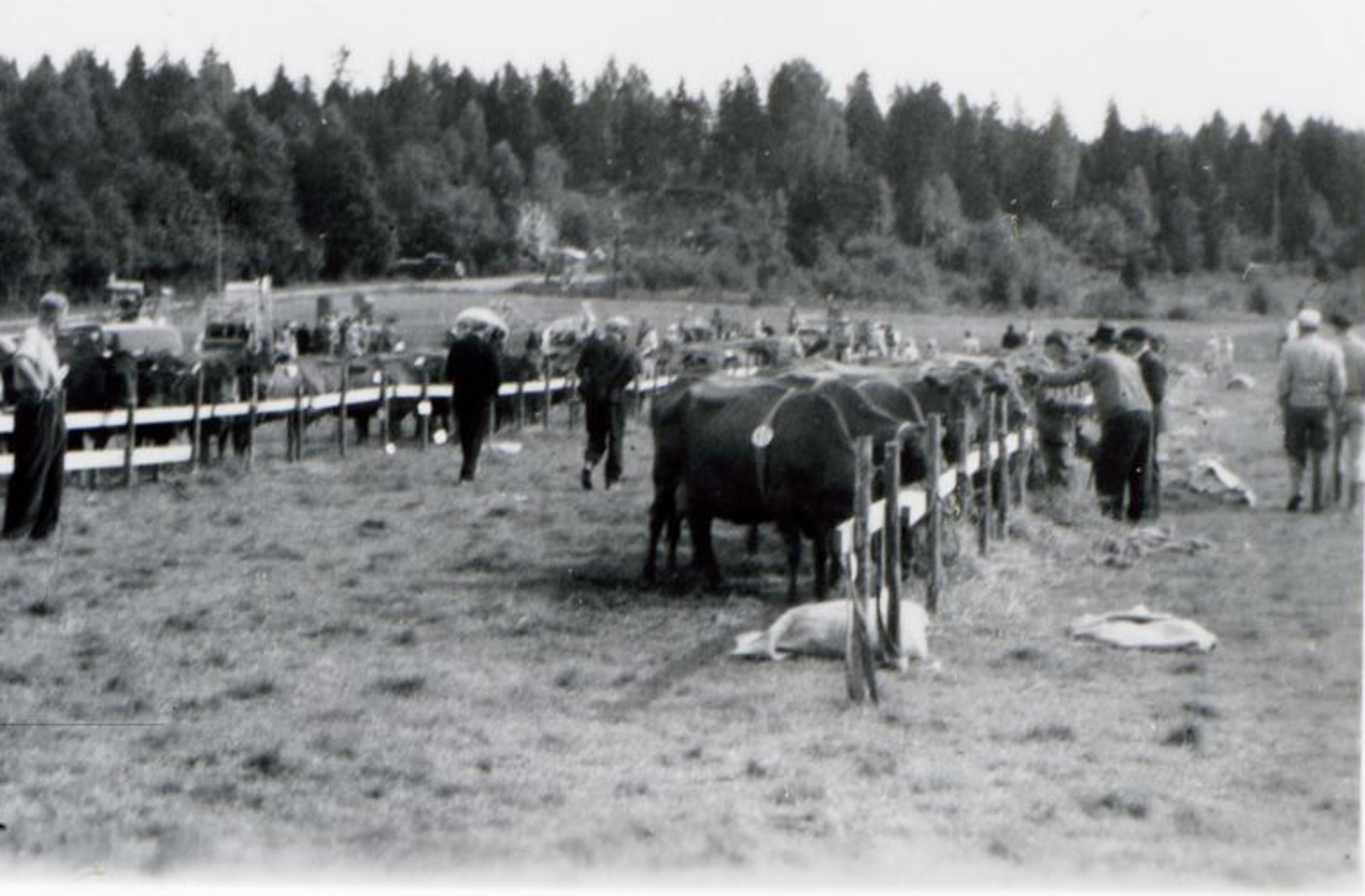 DYRSKUE: Bilde fra dyrskue i Ramnes i 1955. Da hadde tradisjonen, som starta her i Re, eksistert i godt over hundre år allerede. Det sosiale var vel så viktig som det faglige, kan vi lese av beretningene. Foto: Erling Gran.