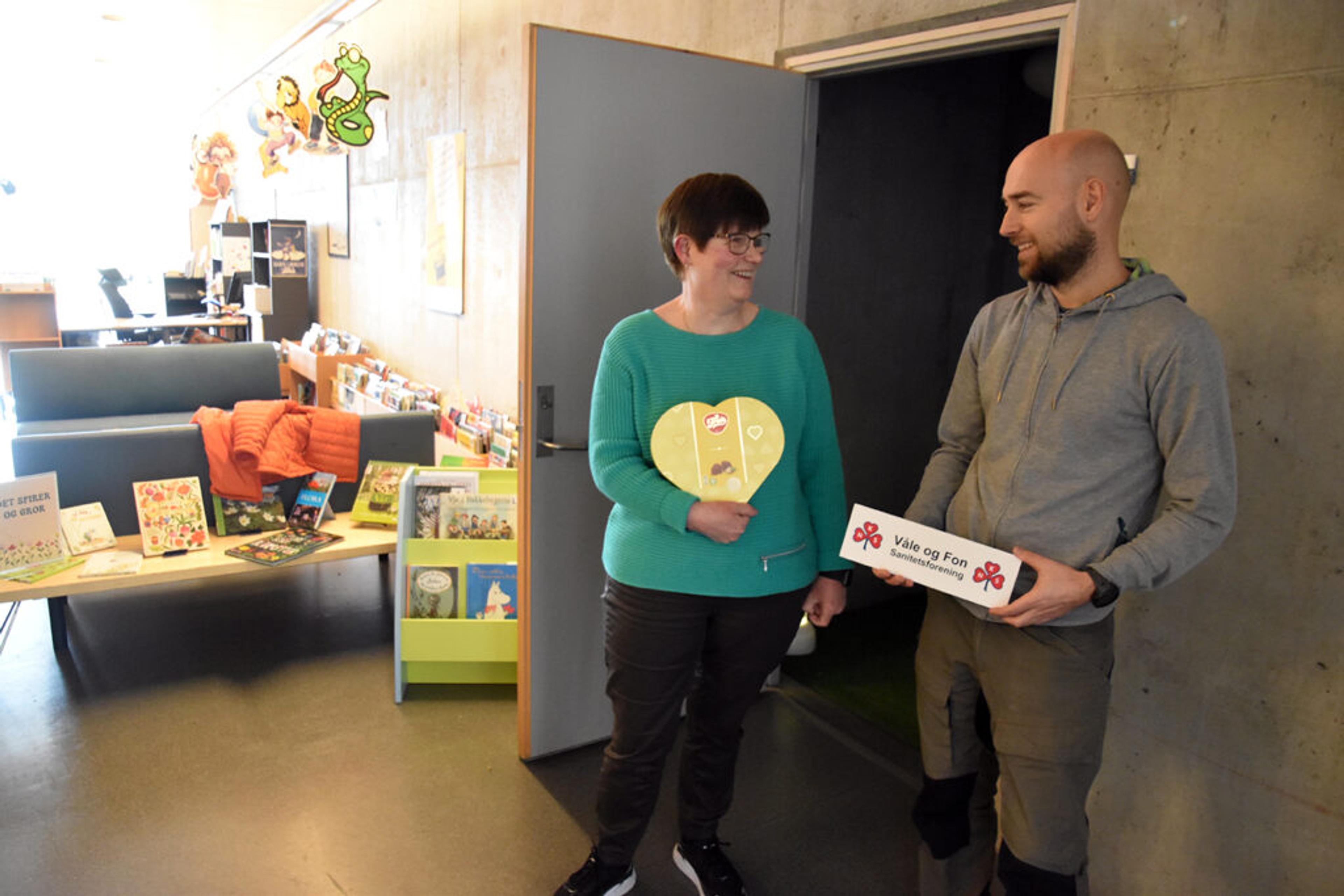 ÅPNING AV SANSEROMMET: Leder i Våle og Fon sanitetsforening Inger Lise Gran overrekker et skilt som skal henge ved sanserommet, Marko Dimitrijevic vil gjerne gi sanitetsforeningen et stort sjokoladehjerte som takk. Foto: Stian Ormestad, ReAvisa.