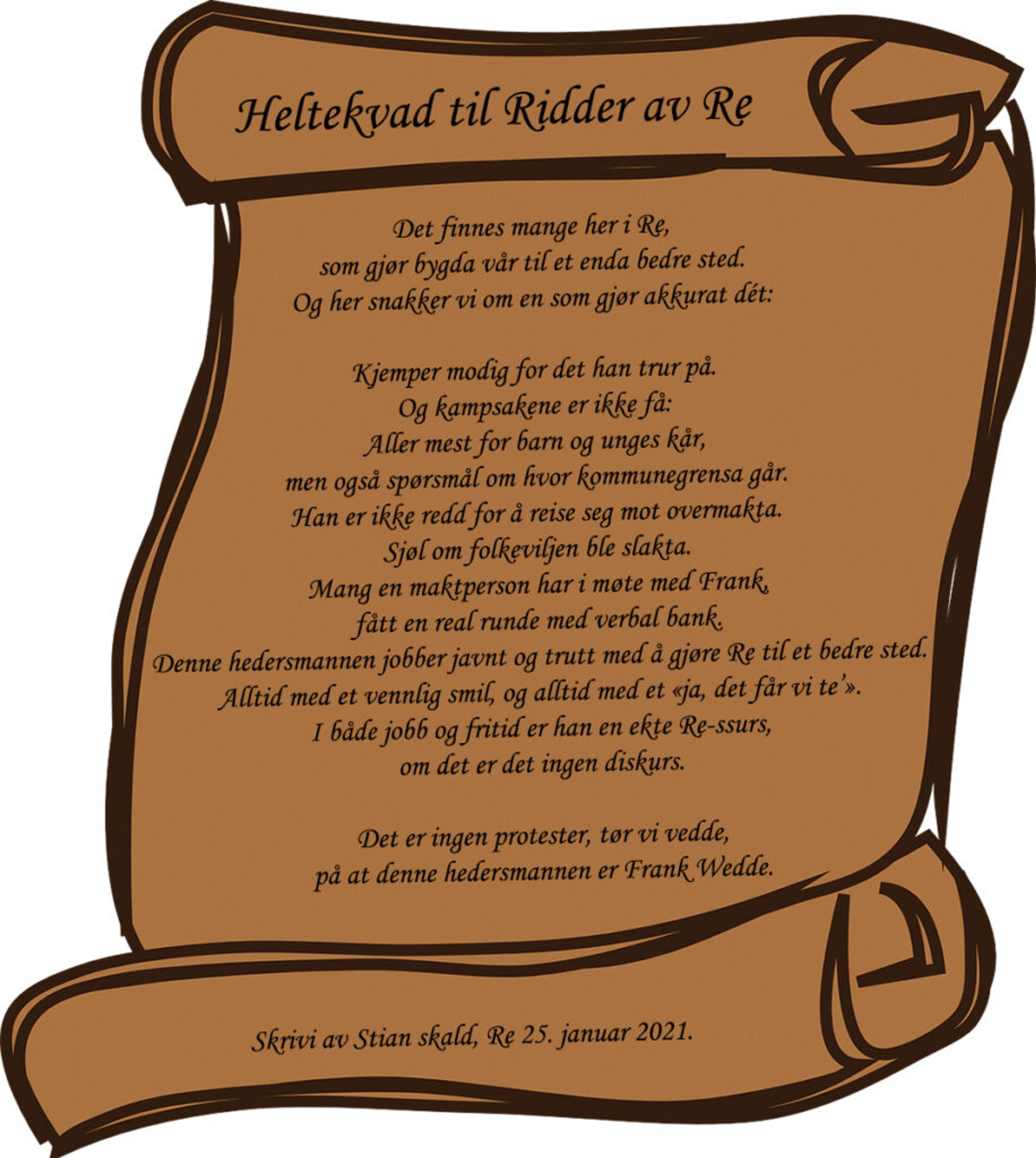 Heltekvadet til ære for den ferske Ridderen av Re så først Frank da ReAvisa lå i postkassa torsdag: – Tusen takk for fantastisk heltekvad, lød det på SMS til skalden samme morgen.