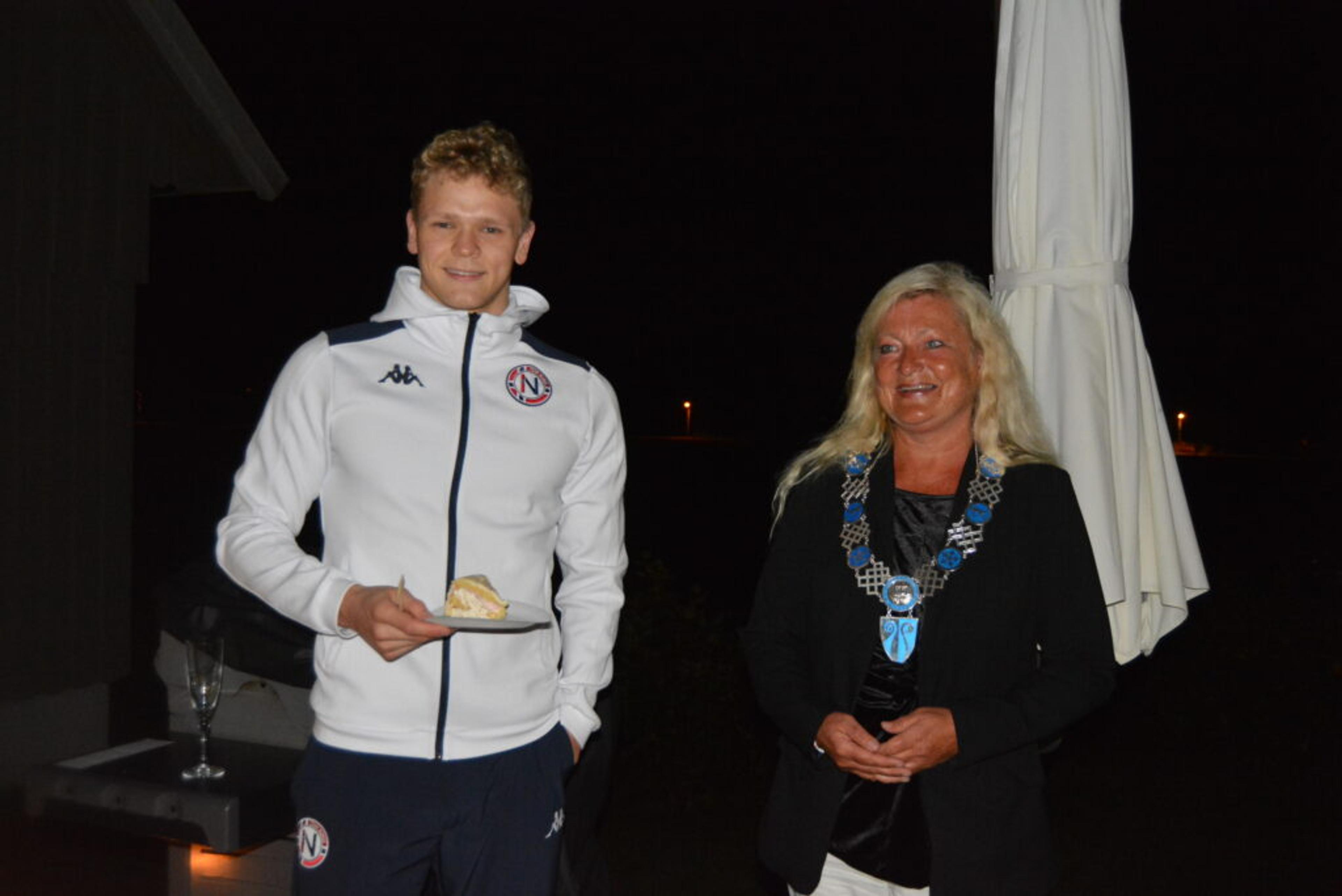 FREDRIK OG ORDFØREREN: En høyst velfortjent velkomst hjemme på Fossan, mener Tønsberg-ordfører Anne Rygh Pedersen (AP). Foto: Lovis Eggum Wallberg.