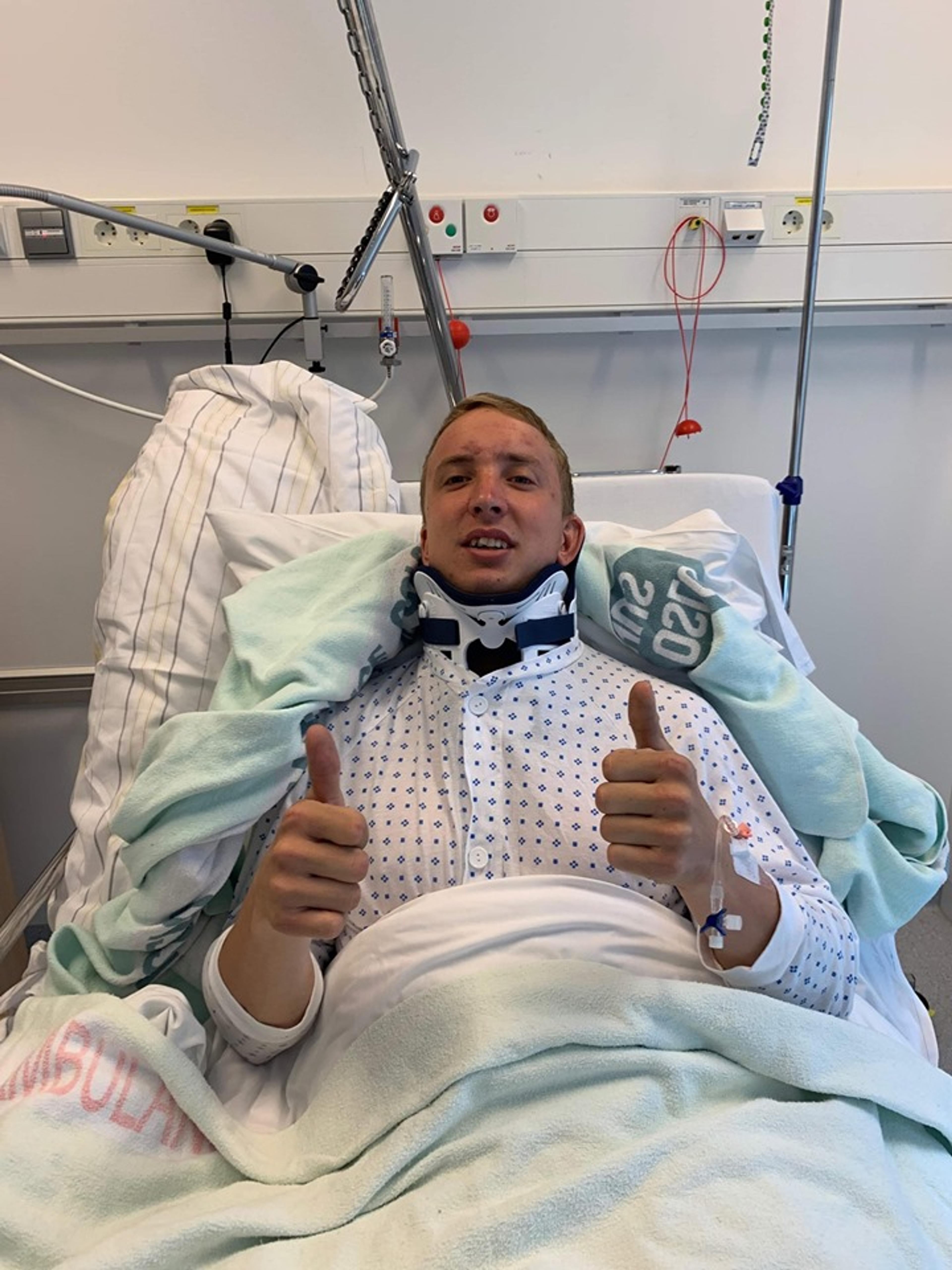 BRUDD I NAKKEN: Fredrik Ommedal (26) med to tomler opp fra sjukesenga. Foto: Privat.