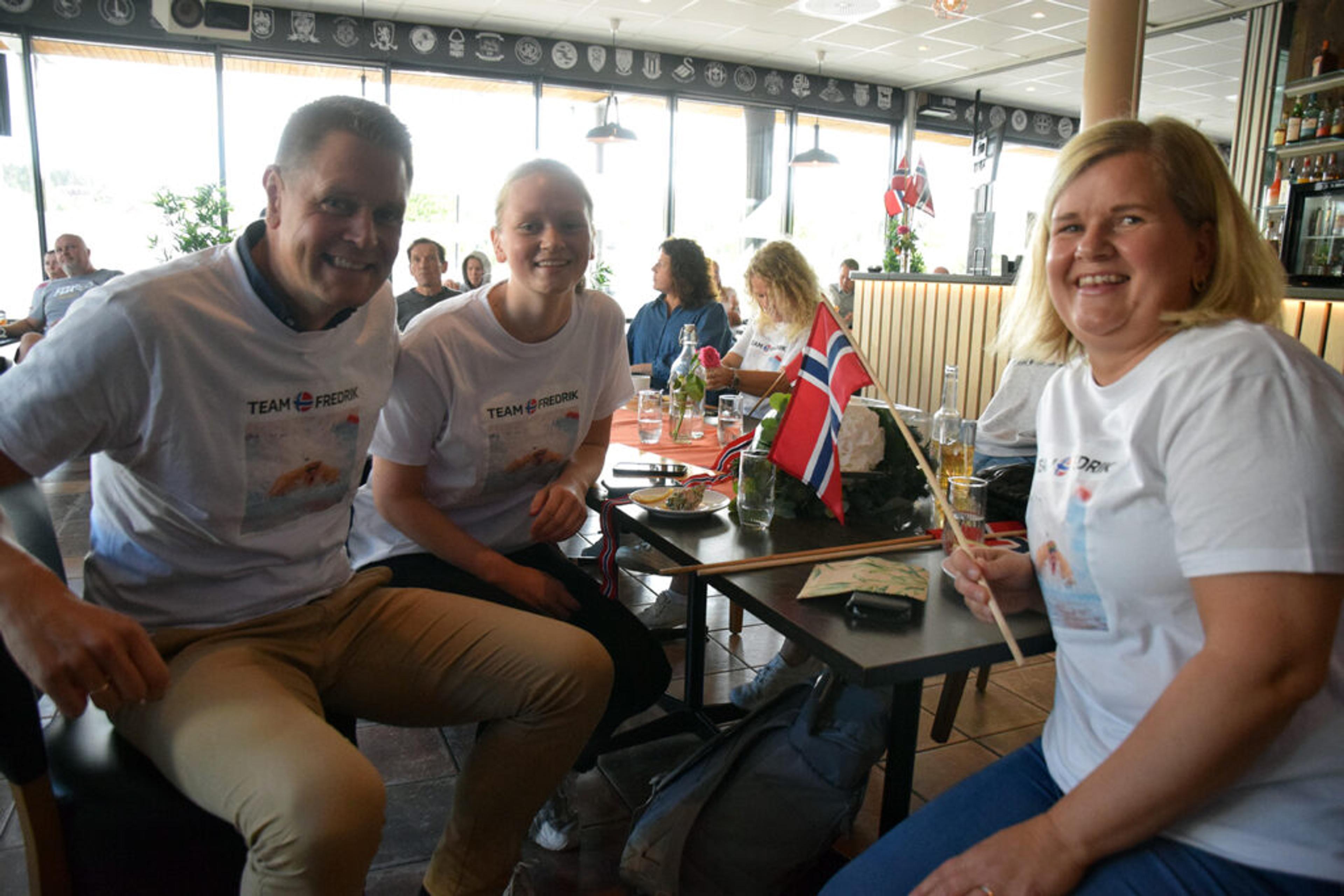 FAMILIEN OG HEIAGJENGEN: Pappa Harald Solberg (45), lillesøster Henriette Solberg (17) og mamma Kristine Solberg (45) skulle helst vært i Tokyo, men det lar seg ikke gjøre i korona-tid. Da er det moro å heie sammen med sambygdinger på Restauranten på Revetal. Foto: Stian Ormestad.