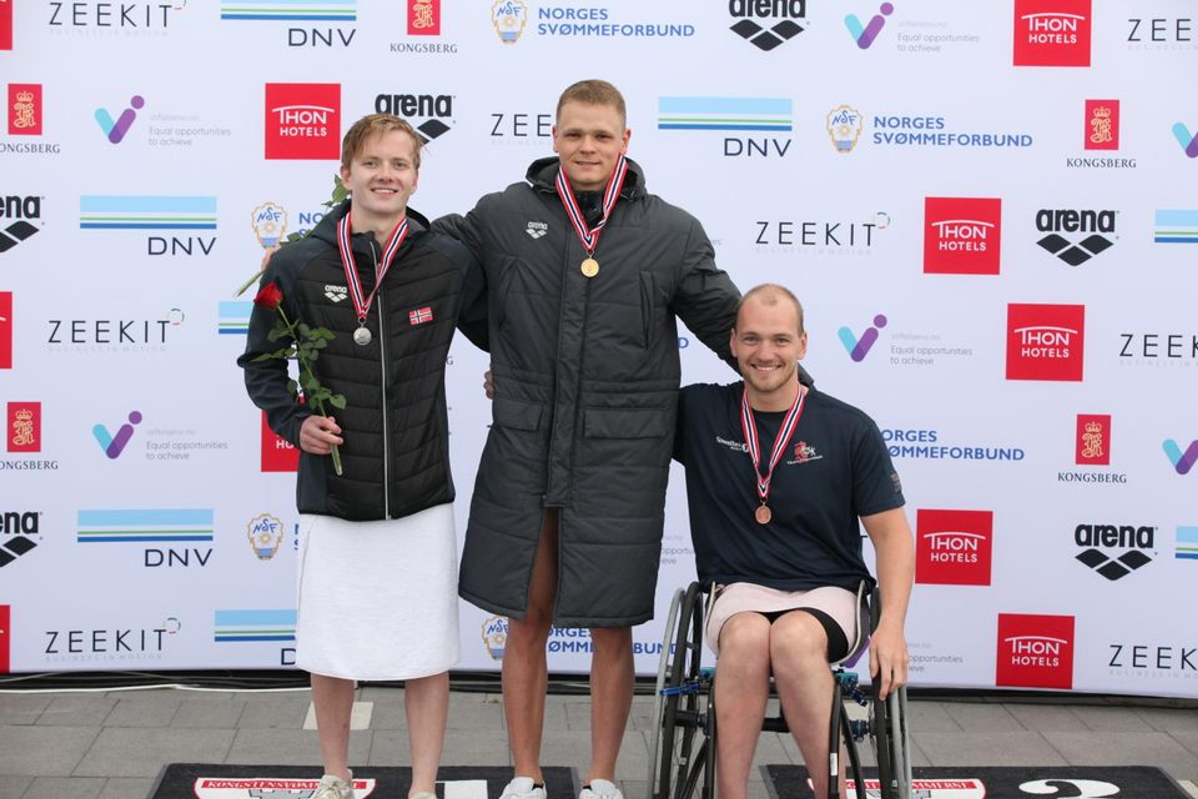PALLEN: Gabriel Steen, Fredrik Solberg og Andreas Bjørnstad på premiepallen etter 50m bryst finale. Foto: Norges Svømmeforbund.