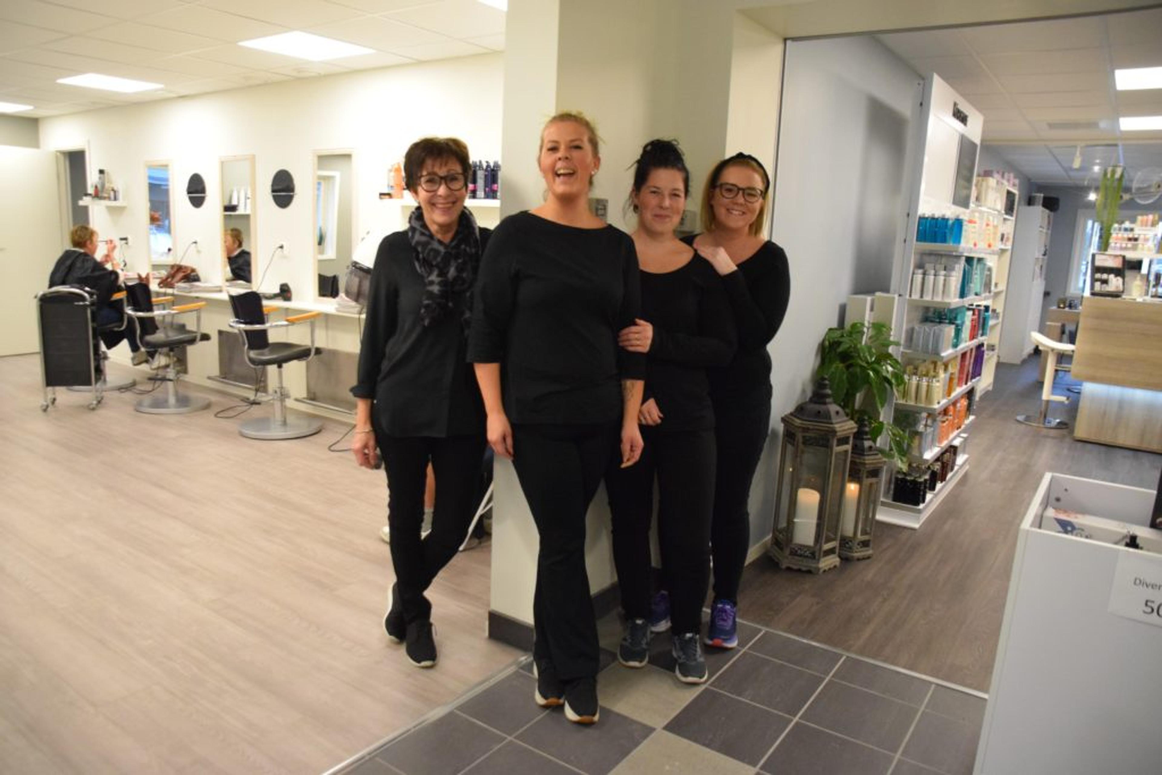 MØTES PÅ FRISØRHJØRNET: Torild Frydenberg driver Revetal dame- og herrefrisør. Anne Merete Erdal driver Re hårstudio, sammen med sine to ansatte Linn Cherie Andersen og Martine Sommerstad. Foto: Stian Ormestad.
