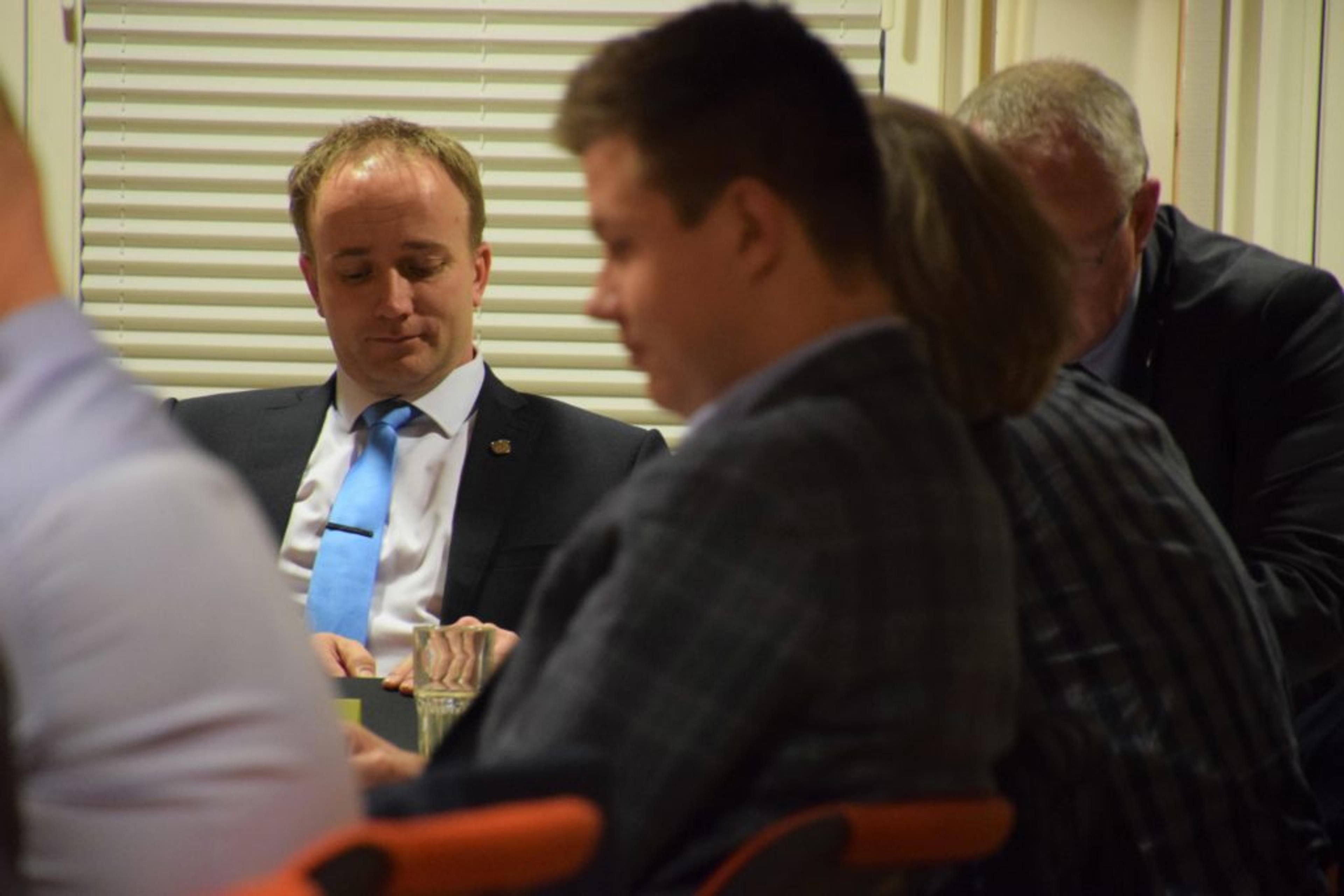 HOLDER PÅ EN HEMMELIGHET: Varaordfører i Re Frode G. Hestnes (FrP) sitter her på en stor hemmelighet gjennom det siste kommunestyremøtet før jul. Foto: Stian Ormestad.