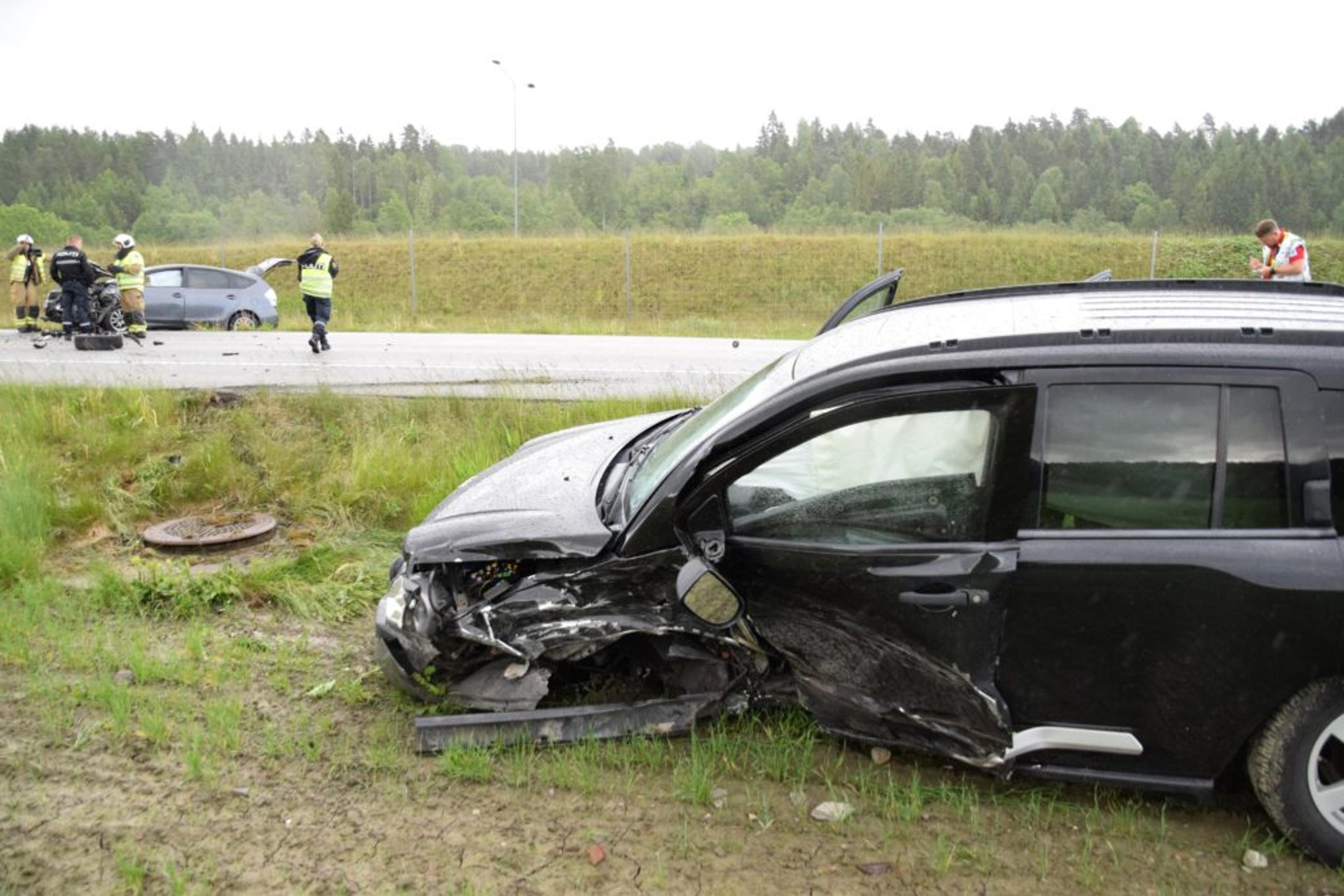STORE MATERIELLE SKADER: Begge bilene er prega av et hardt sammenstøt. Foto: Stian Ormestad.