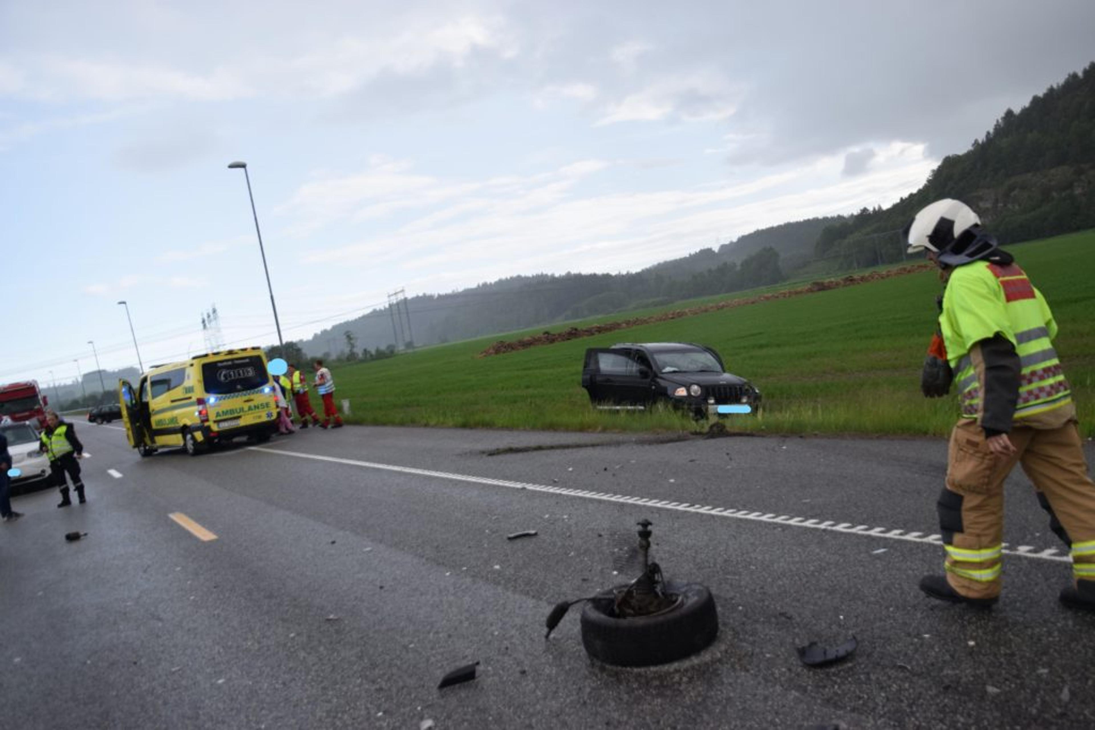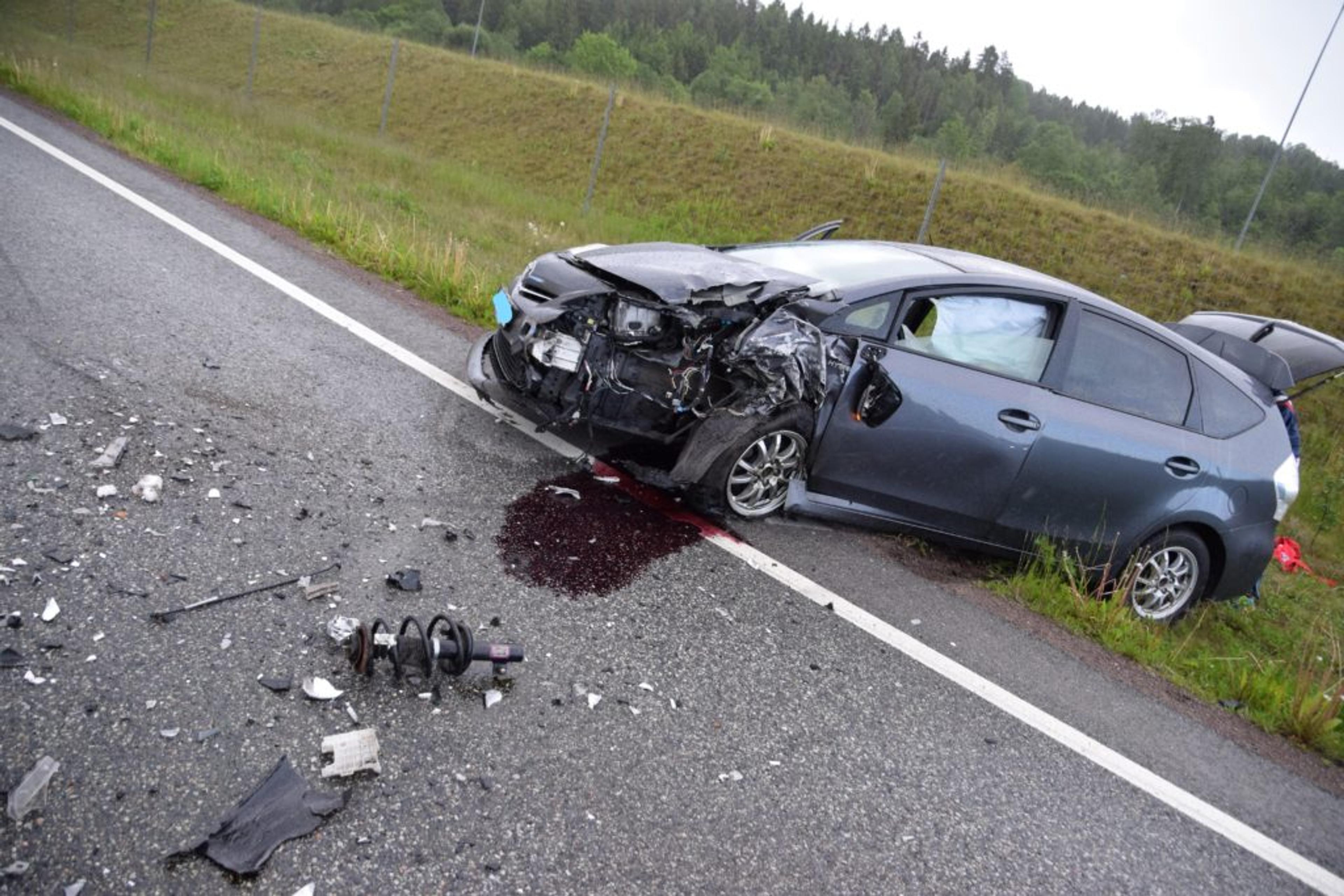 STORE MATERIELLE SKADER: Vrakdeler ligger strødd i veibanen. Foto: Stian Ormestad.