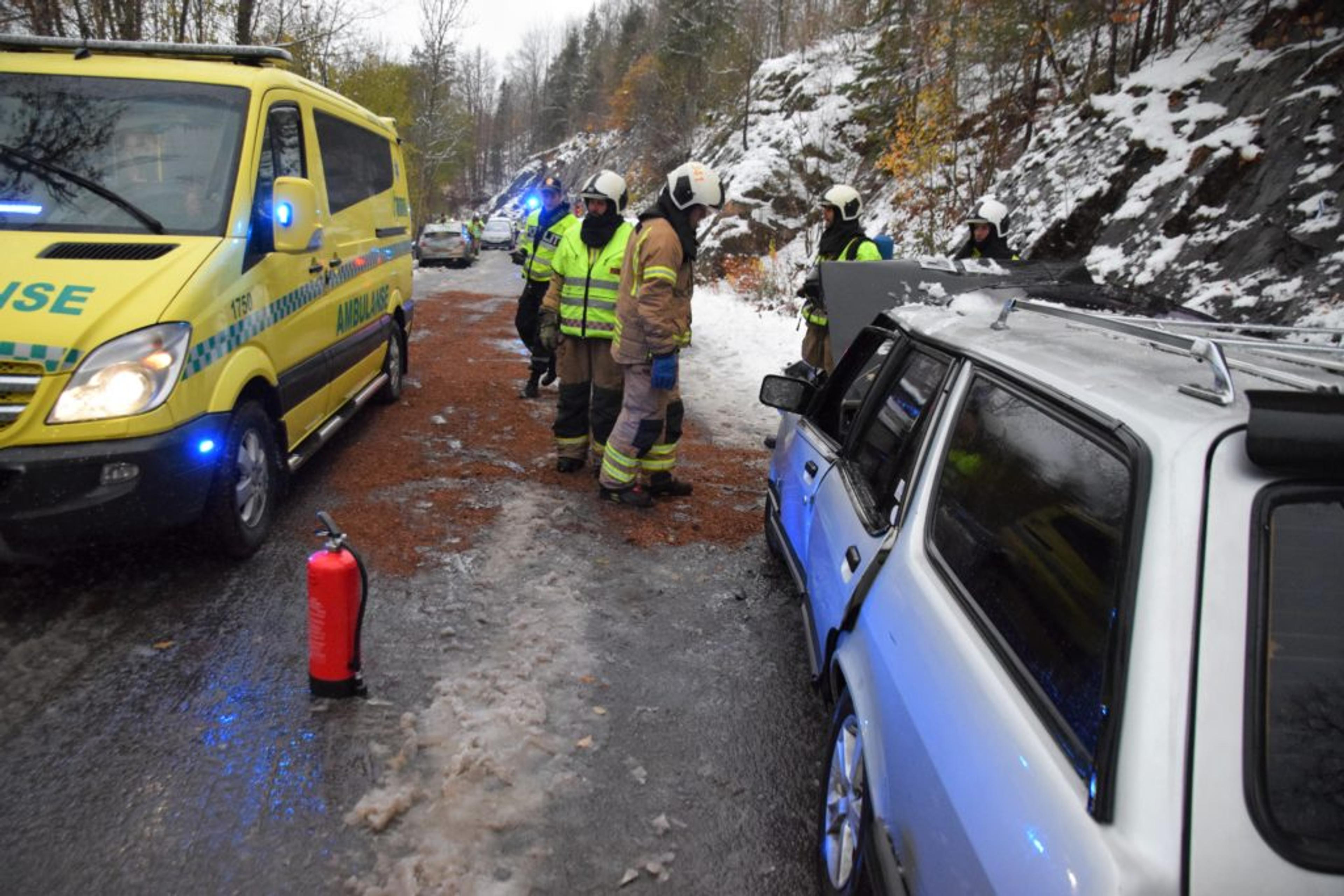 SIKRER SKADESTEDET: Brannmannskap kopler fra strømmen og sanerer veibanen for søl fra vrakene. Foto: Stian Ormestad.