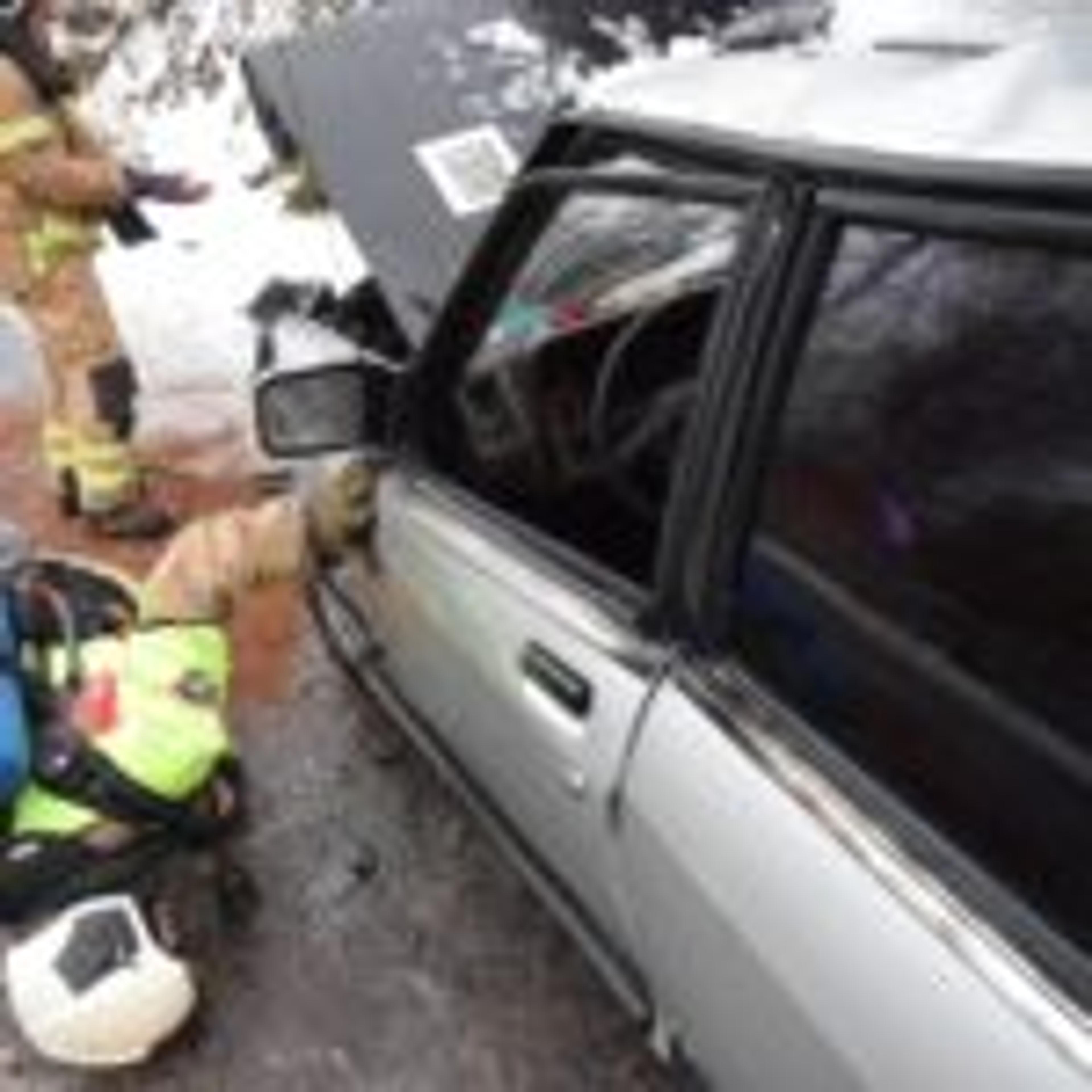 SANERING: Brannmannskap sikrer skadestedet. Granada-en er et sørgelig syn. Foto: Stian Ormestad.