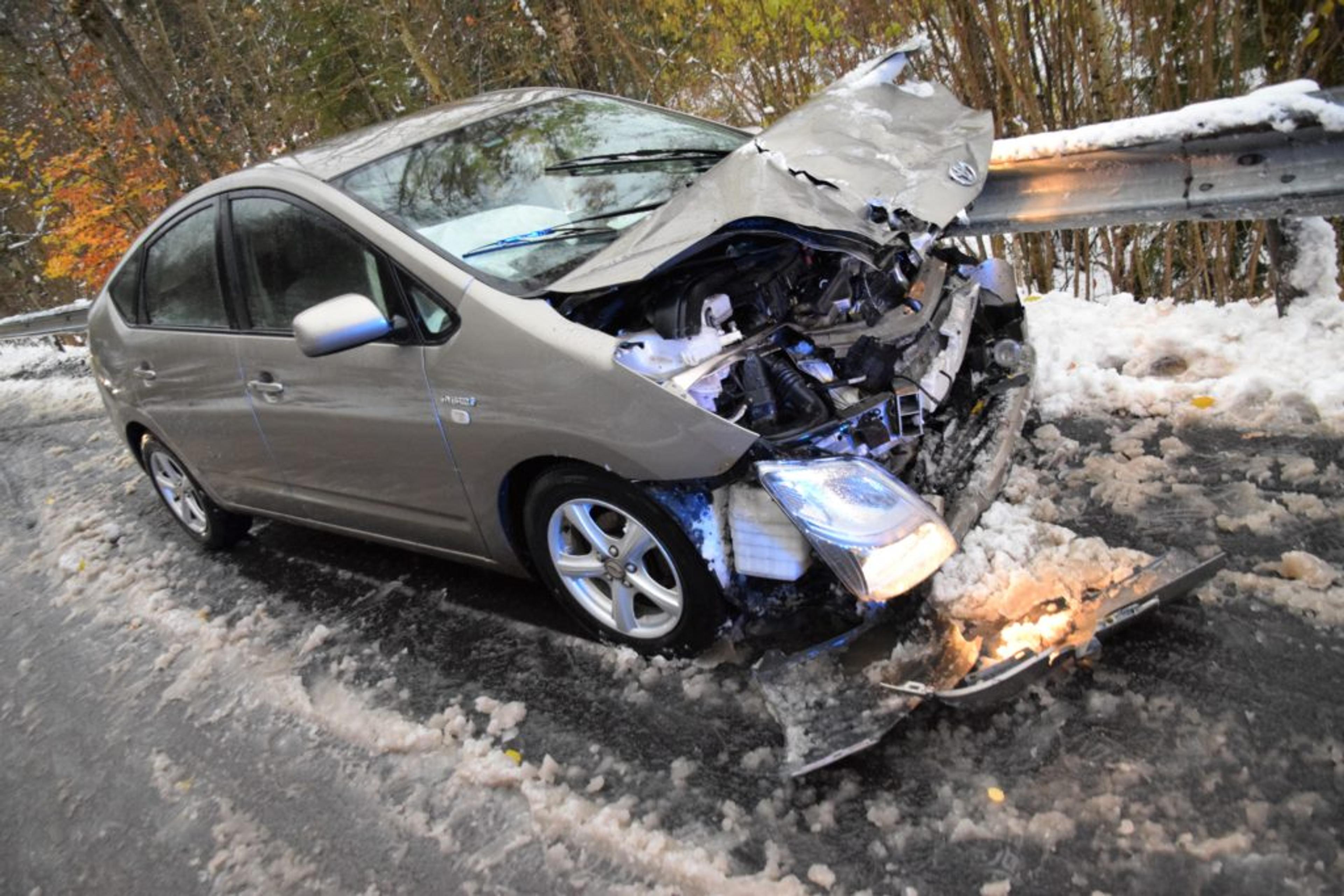 Johan kom ikke så langt før han fikk et ublidt møte med en langt mer moderne Toyota Prius på vinterens første snø.