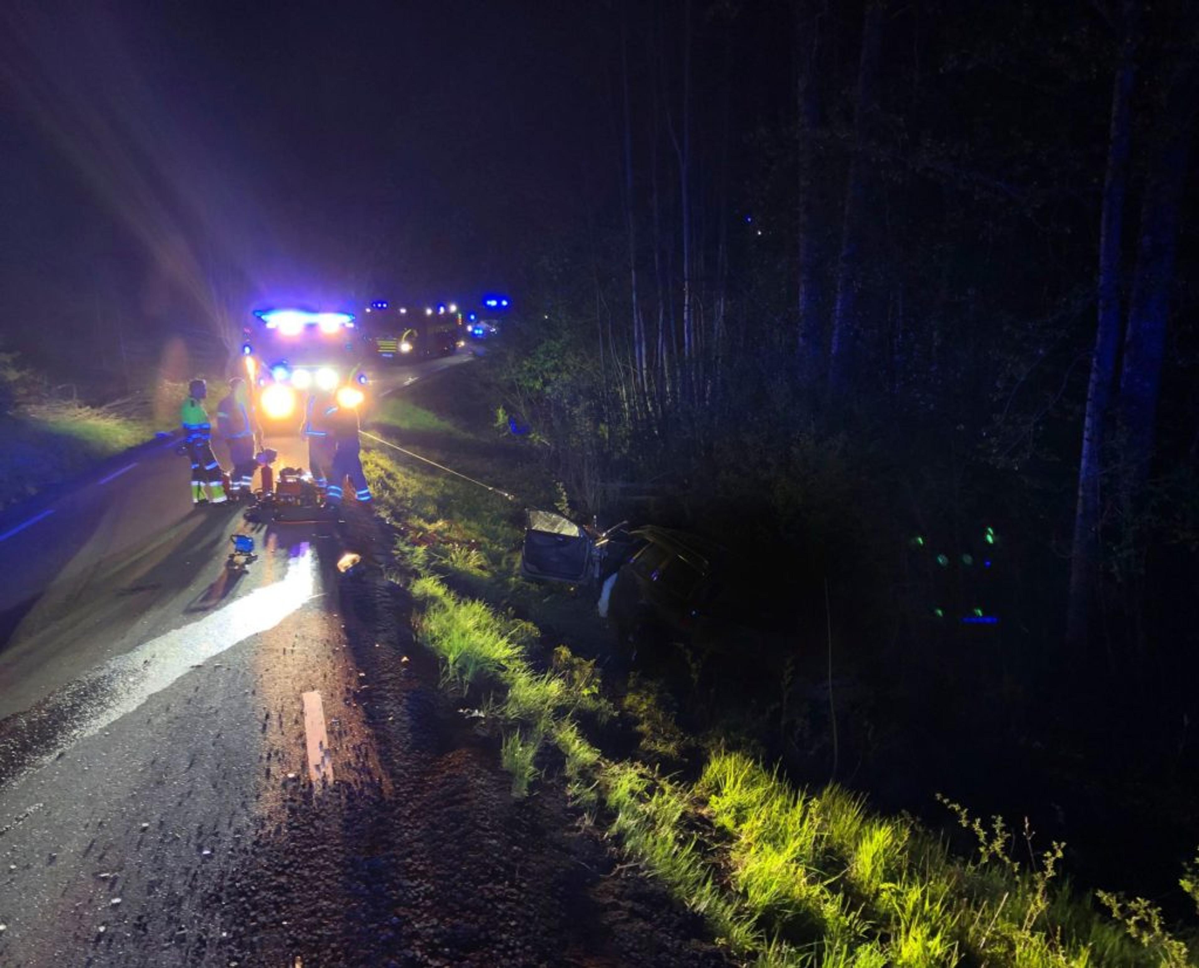 Den ene bilen har kommet over i feil kjørebane. Ifølge brannmannskap står den ene bilen i veien, mens den andre står tre – fire meter nede i en skråning.