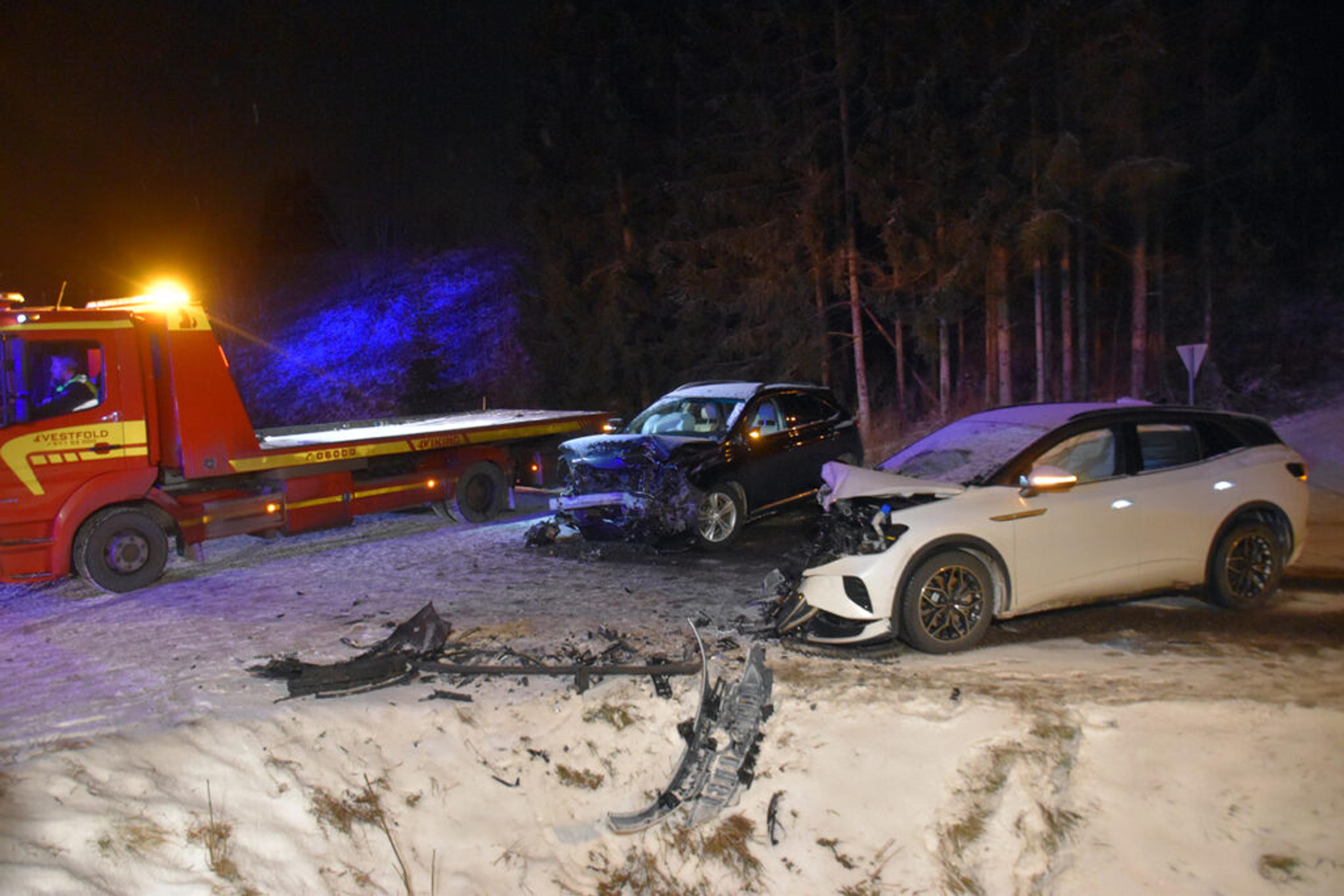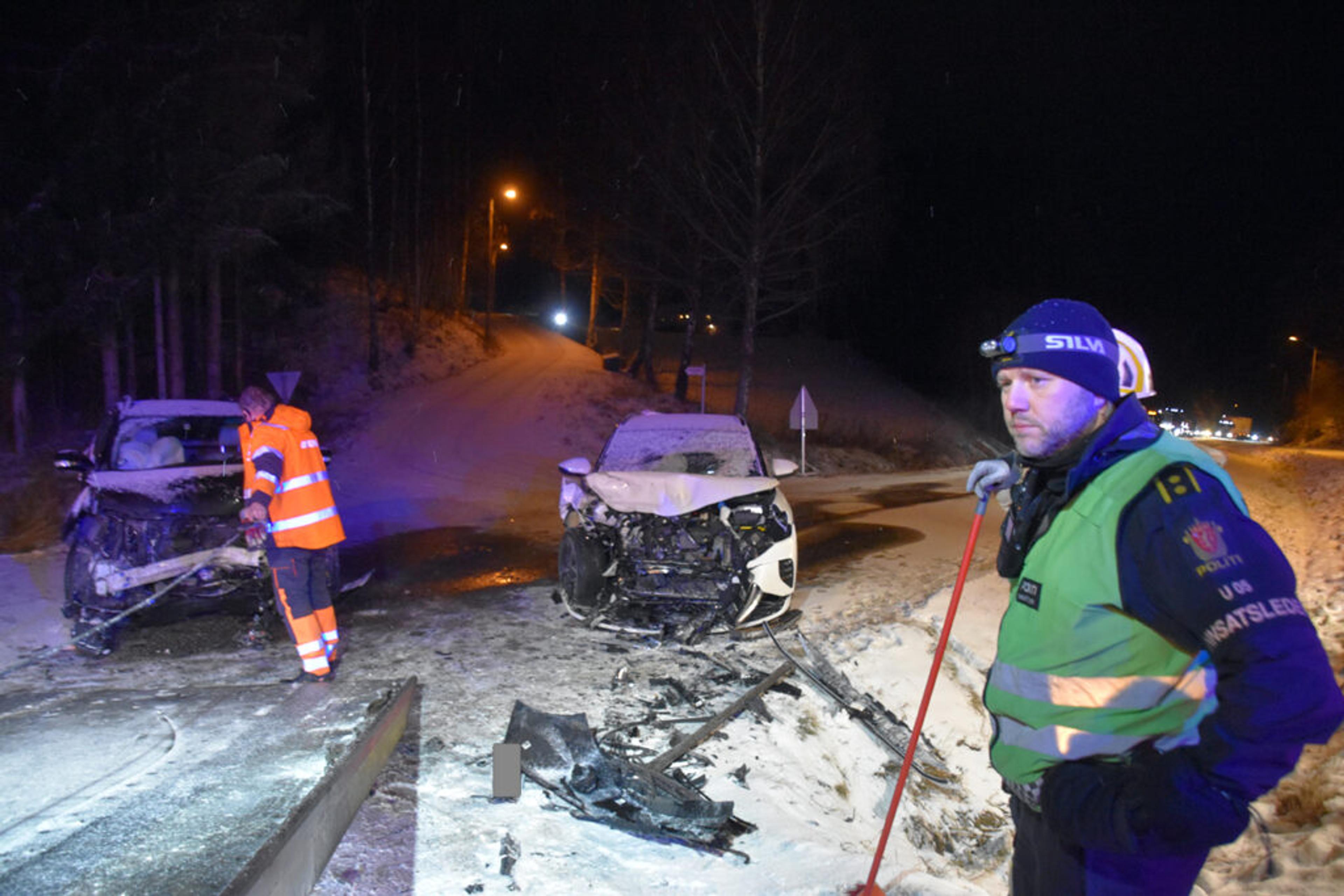 Bilene har treffi hverandre front mot front, og alle airbager er utløst. Politiet i Sør-Øst melder på Twitter at det er ukjent skadeomfang på de involverte.