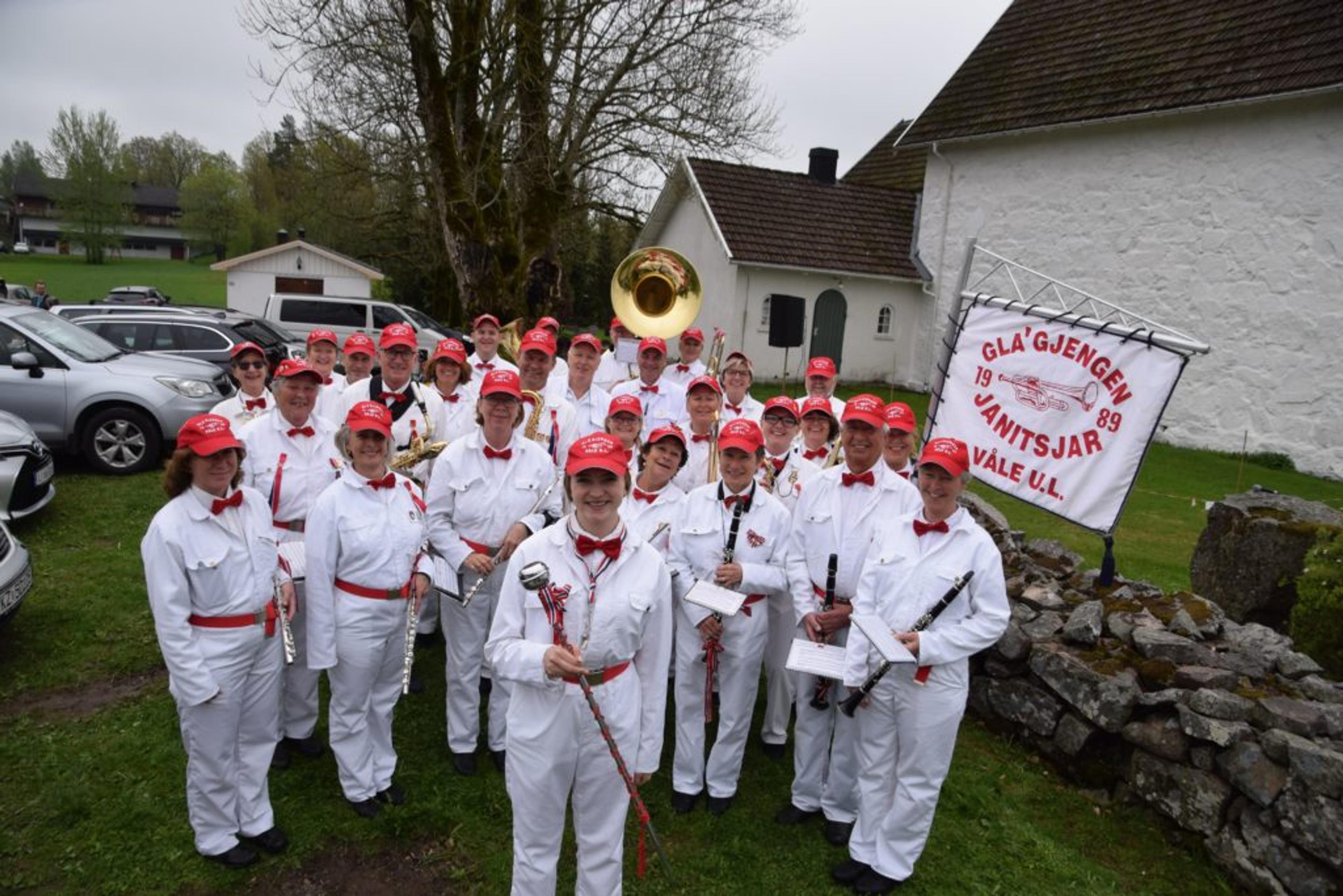NYTTÅRSKONSERT: Gla’gjengen arrangerer annet hvert år nyttårskonsert i Våle, her er den glade gjengen fotografert utenfor Fon kirke på 17. mai i fjor. Foto: Stian Ormestad.