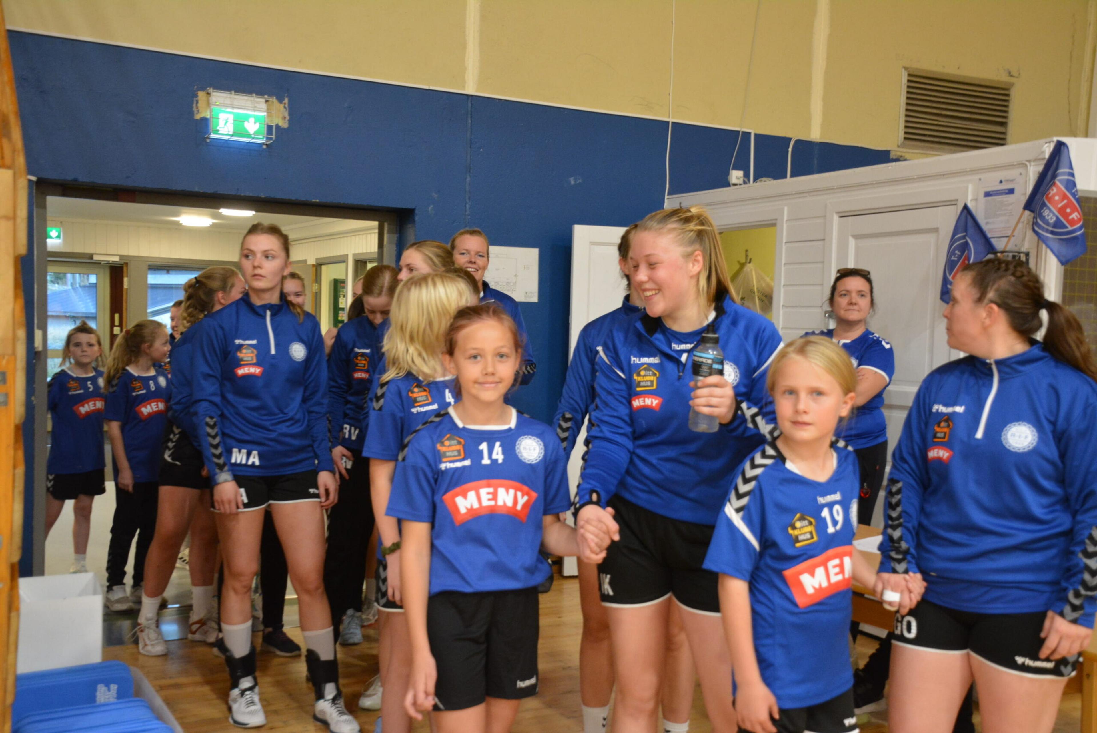 HÅNDBALLGLEDE: Ramnes IFs Jenter 10 er maskoter og løper ut sammen med spillerne på Ramnes IFs A-lag. Det er nesten tjue måneder siden sist de gikk på banen i Ramneshallen, før comebacket etter korona søndag 26. september 2021. Foto: Lovis Eggum Wallberg.