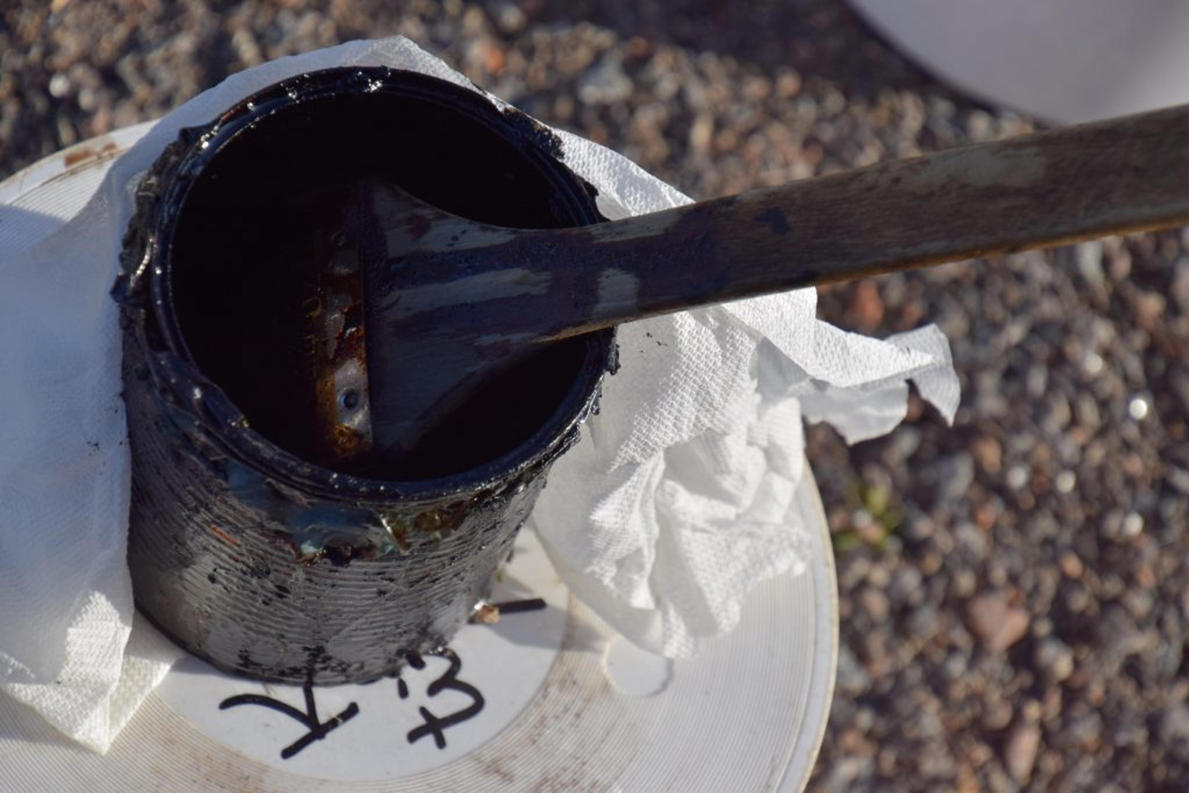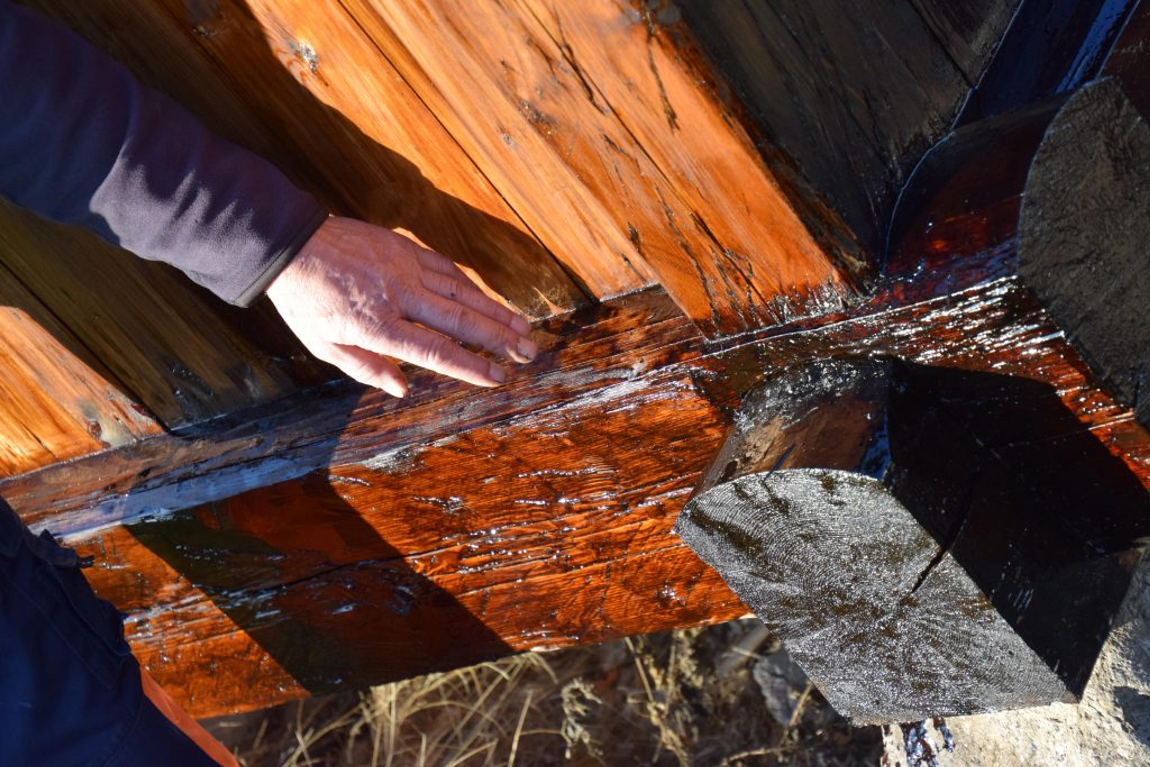 Den tjukke tjæra blir så blanda med terpentin igjen, sånn at det blir en prefekt tjæreblanding. Akkurat som man i «alle tider» har behandla treverk med. Og som det står i Magnus Lagabøters landslov av 1276, ble stua beisa med tjære «etter lauvfall og før snøfall».