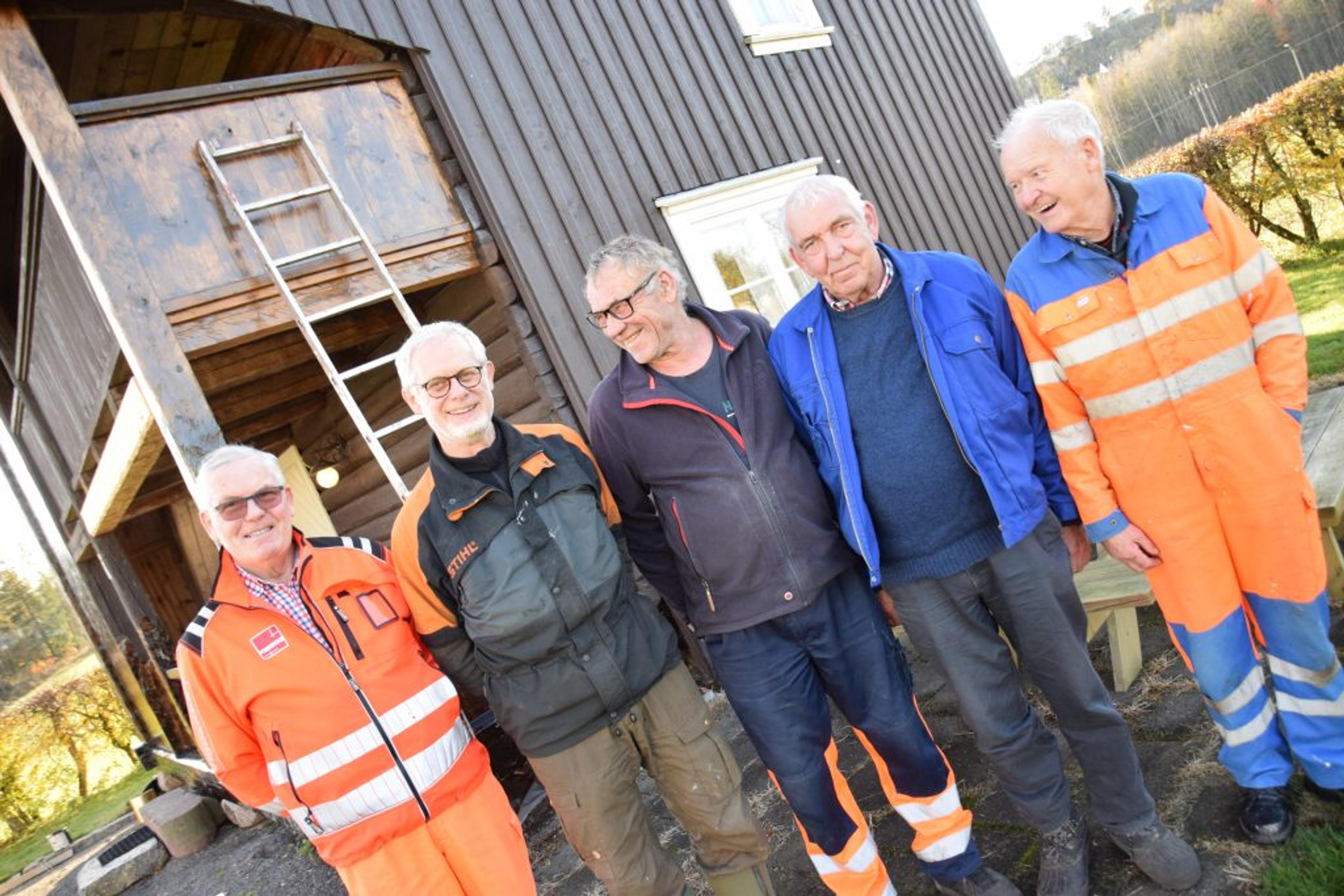 TJÆRING AV LUKASSTUA: Dugnadsgjengen like før vinterens første snø, ved Jan Vidar Bjune, Kåre Holtung, Roar Mørken, Ragnar Gjerpe og Sverre Sjue. Foto: Stian Ormestad.