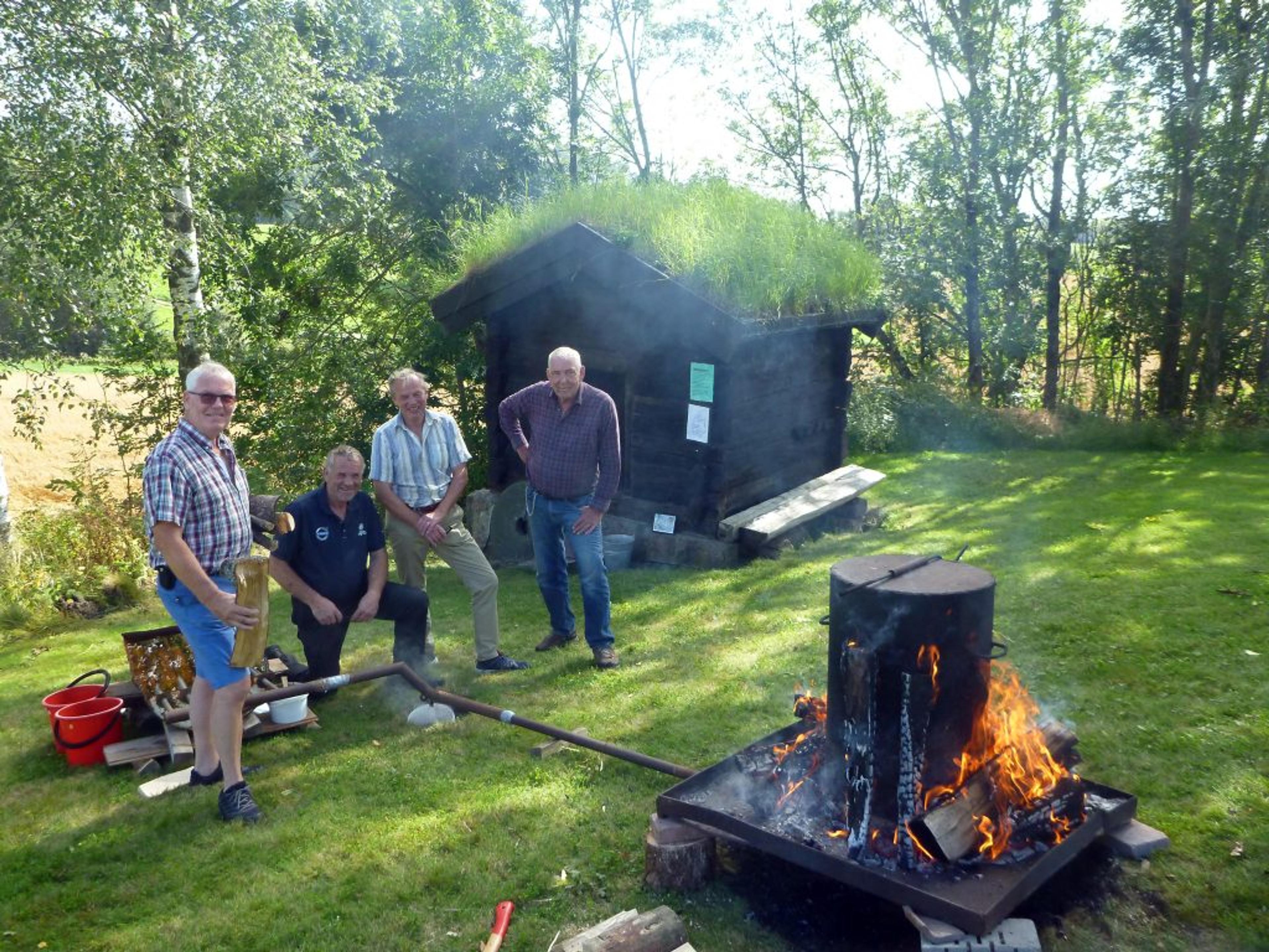 TJÆREPRODUKSJON: Tjærebrenning under Åpen gård på Bygdetunet Brår i sommer. Foto: Per Bjerkø.