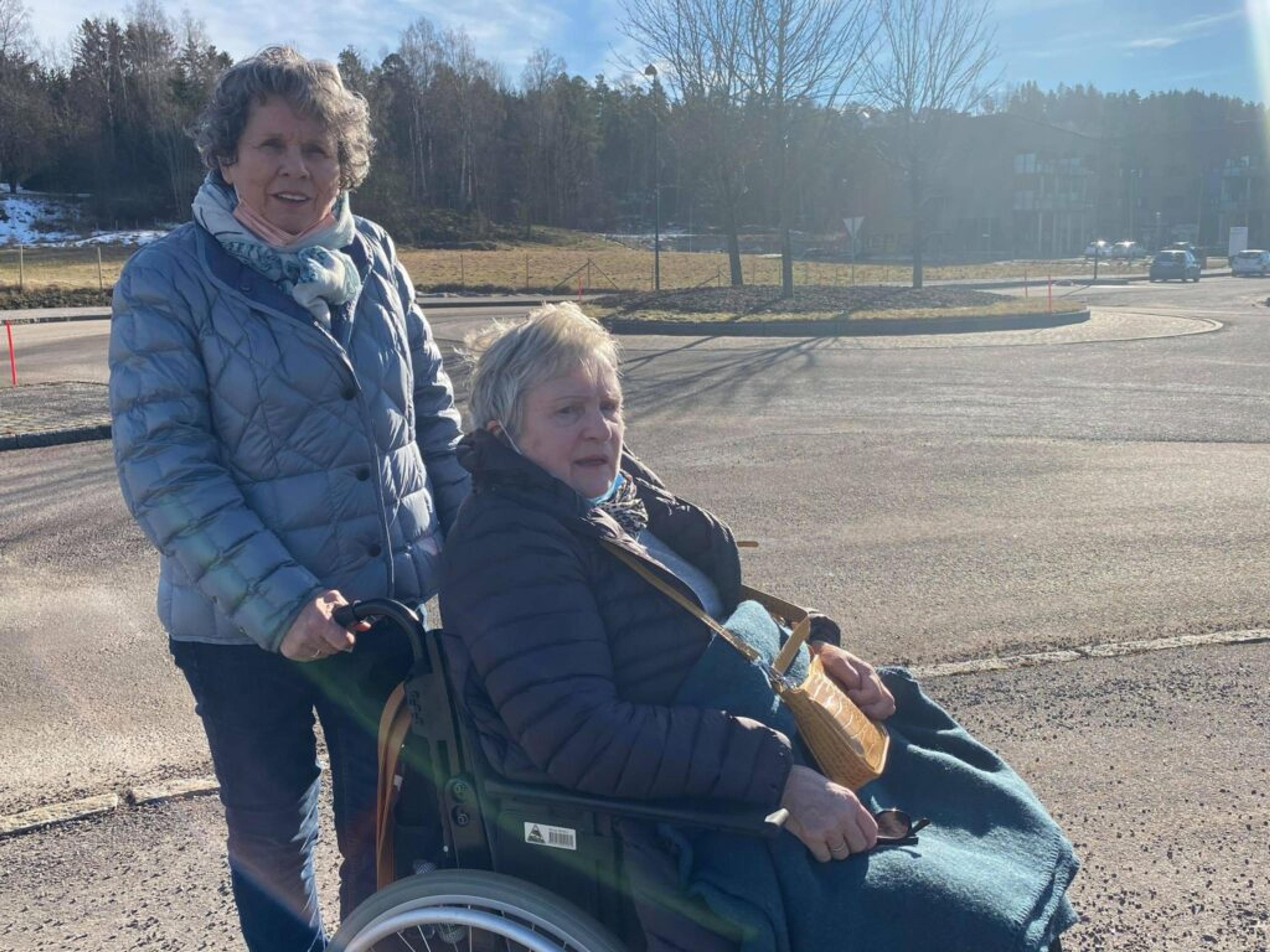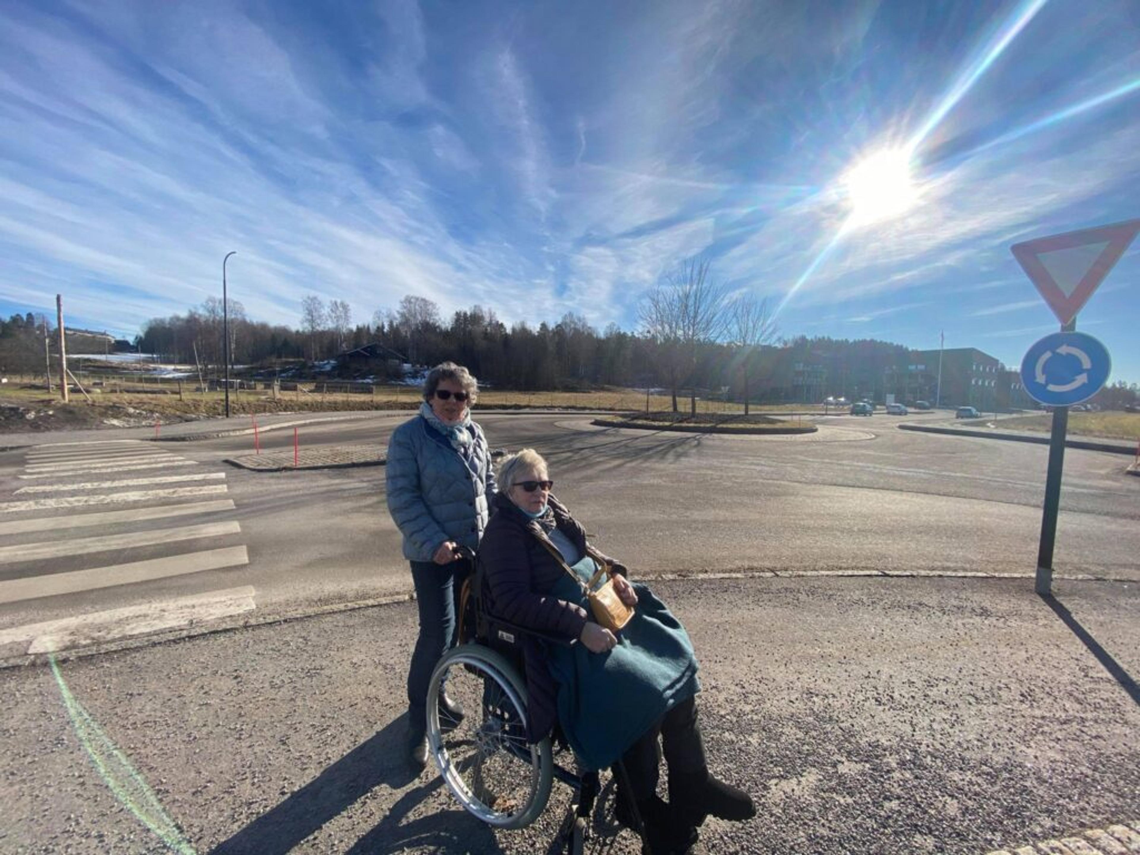 ALLIERTE: Et fotgjengerfelt på veien forbi Re helsehus bør komme på plass, mener Solveig og Anne Marie. Besøksvenn og beboer er blitt venninner på faste lufteturer Revetal rundt. Foto: Stian Ormestad.