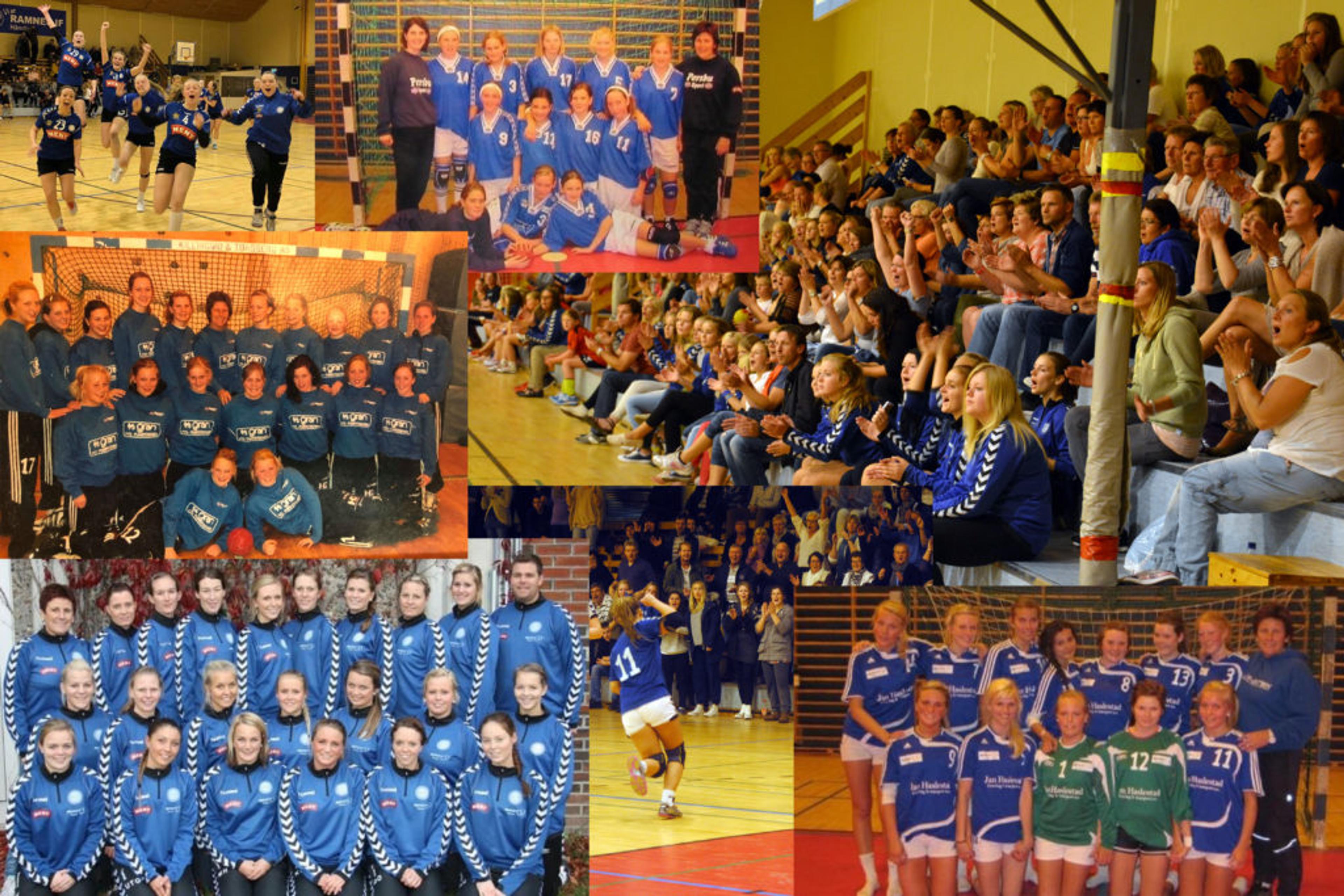 RAMNES HÅNDBALL: Anita Stange Kjølstad har vært en viktig del av Ramnes håndball i flere tiår. Her er noen av de mange lagbildene som er tatt opp gjennom åra. Fotomontasje: Stian Ormestad / privat.