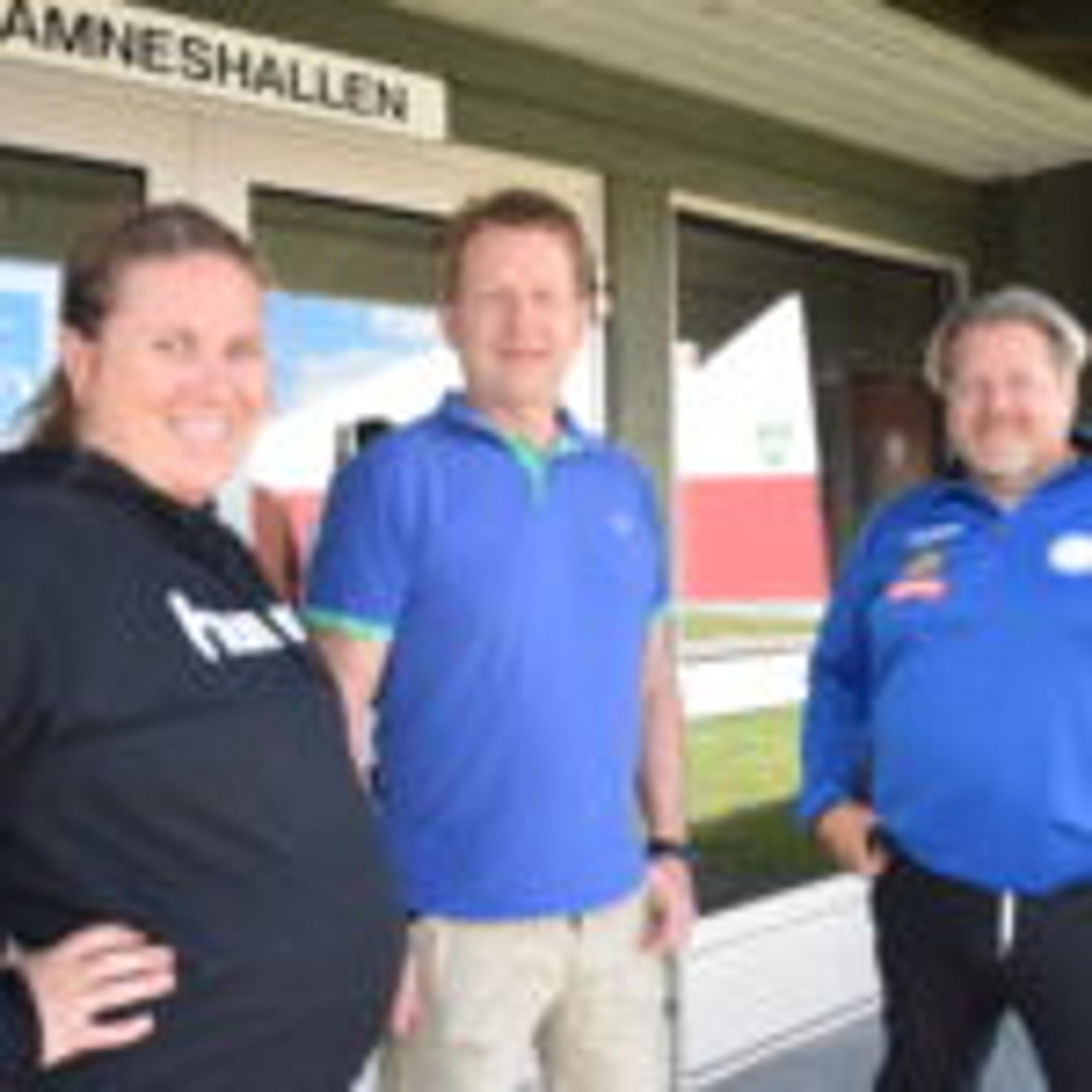 MENINGSFULLT: Morten Kjølstad (i midten) har mange timer i Ramneshallen, for å se på kone og barn spille, trene, organisere og stå på for håndballen. Eldstedatter Katinka til venstre, og sportslig leder for Ramnes håndball Ronny Bekkevold til høyre. Foto: Stian Ormestad.