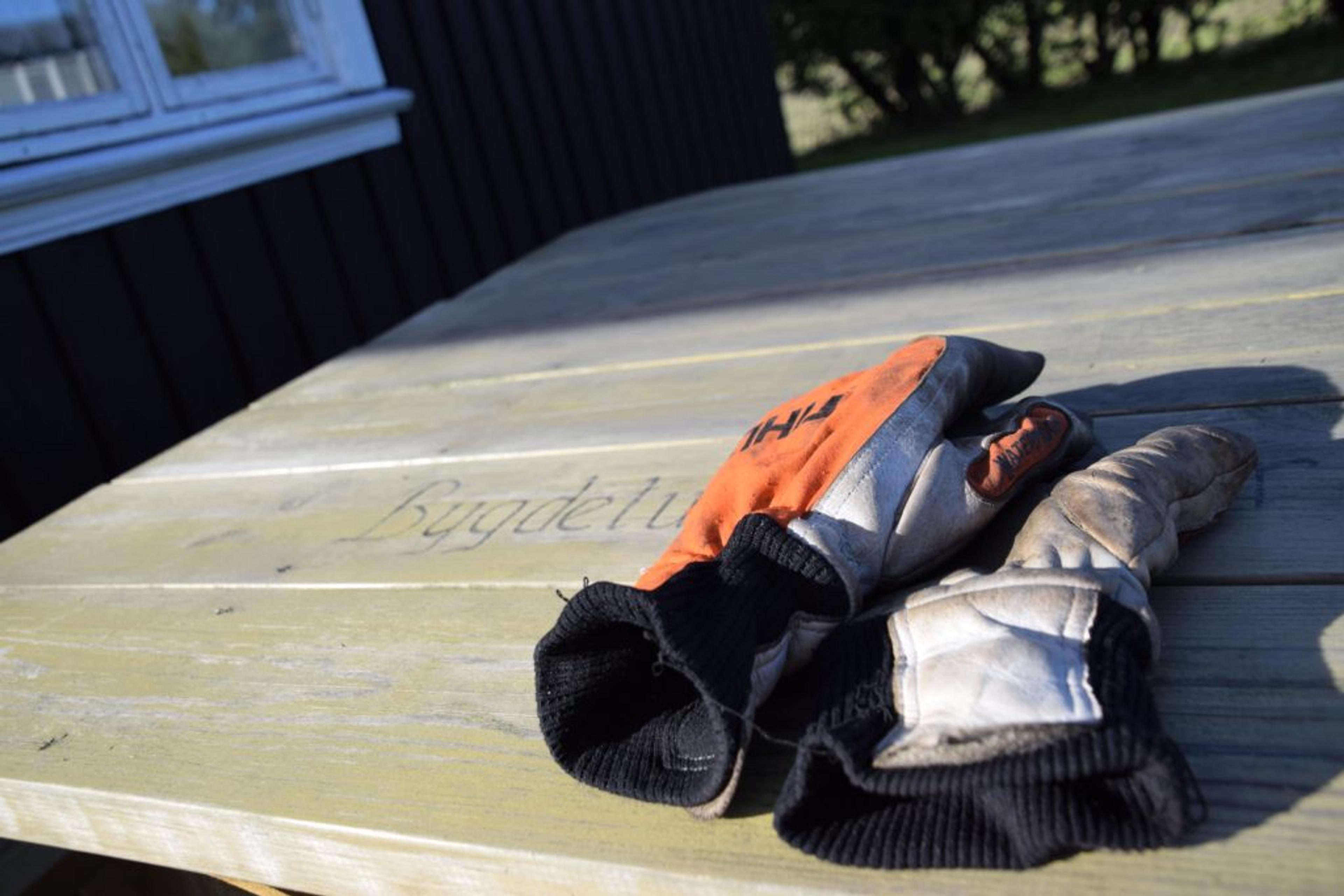 DUGNAD: Ett par hansker ligger igjen etter dugnad på uteområdene her om dagen. Da ble hekken frisert, blant annet. Seinere i høst skal vinduene få seg et strøk maling. Og Ramnes historielag håper også på å komme i gang med arbeidene på Lucasstua før vinteren setter inn. Foto: Stian Ormestad.