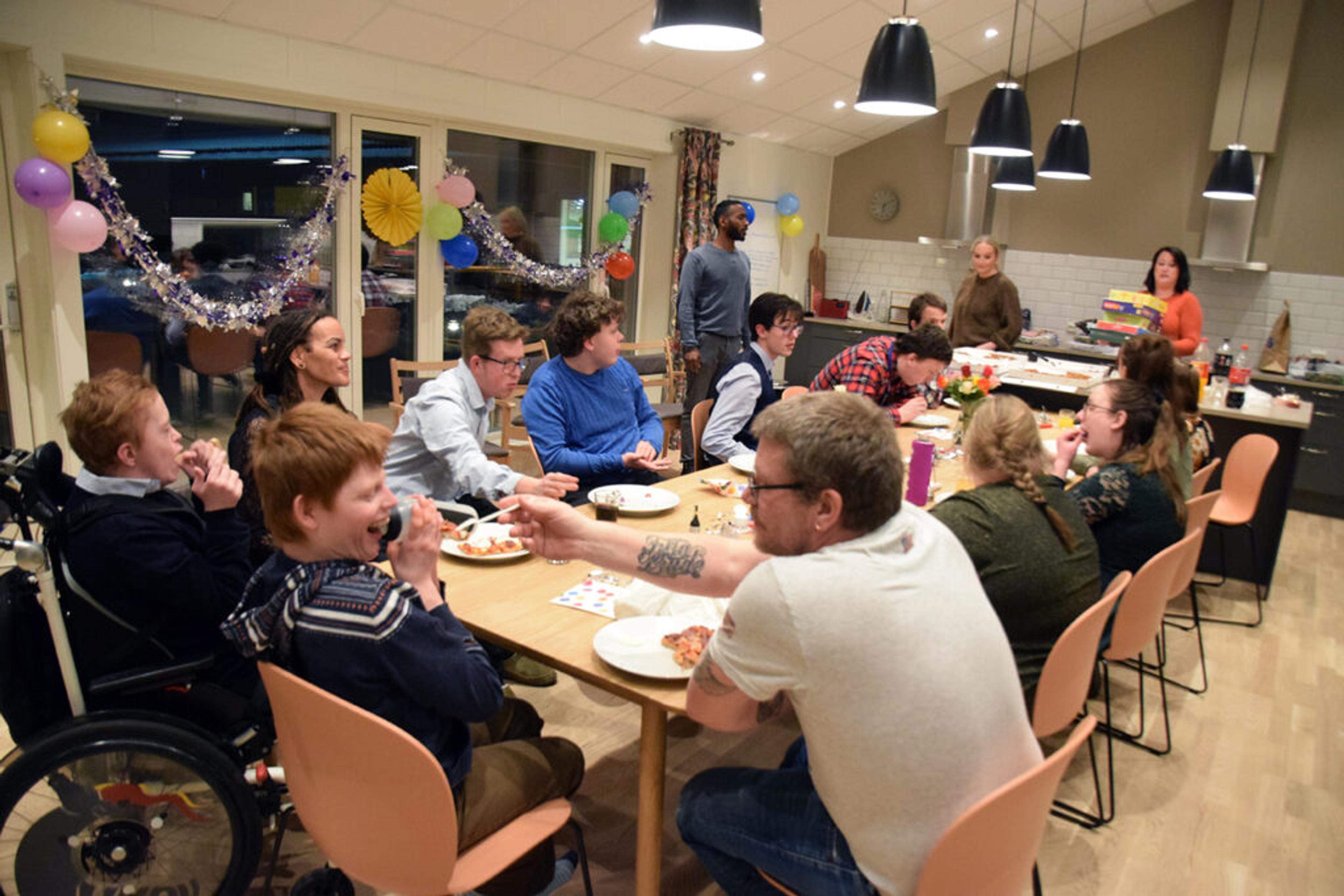 HUSET MITT: Det nybygde Huset mitt-borettslaget på Brår fikk overrakt spillene på samme dag som det skulle feires firedobbel bursdag. Jon Raaum Christensen hadde fylt 21 år, det samme hadde Sondre Stenborg. Olivia Stranna Holt var blitt 24 år, og Tobias Frydenlund hadde bursdag akkurat denne dagen og ble 23 år gammel. Brettspillene ble en ekstra fin “bursdagsgave”. Foto: Stian Ormestad.
