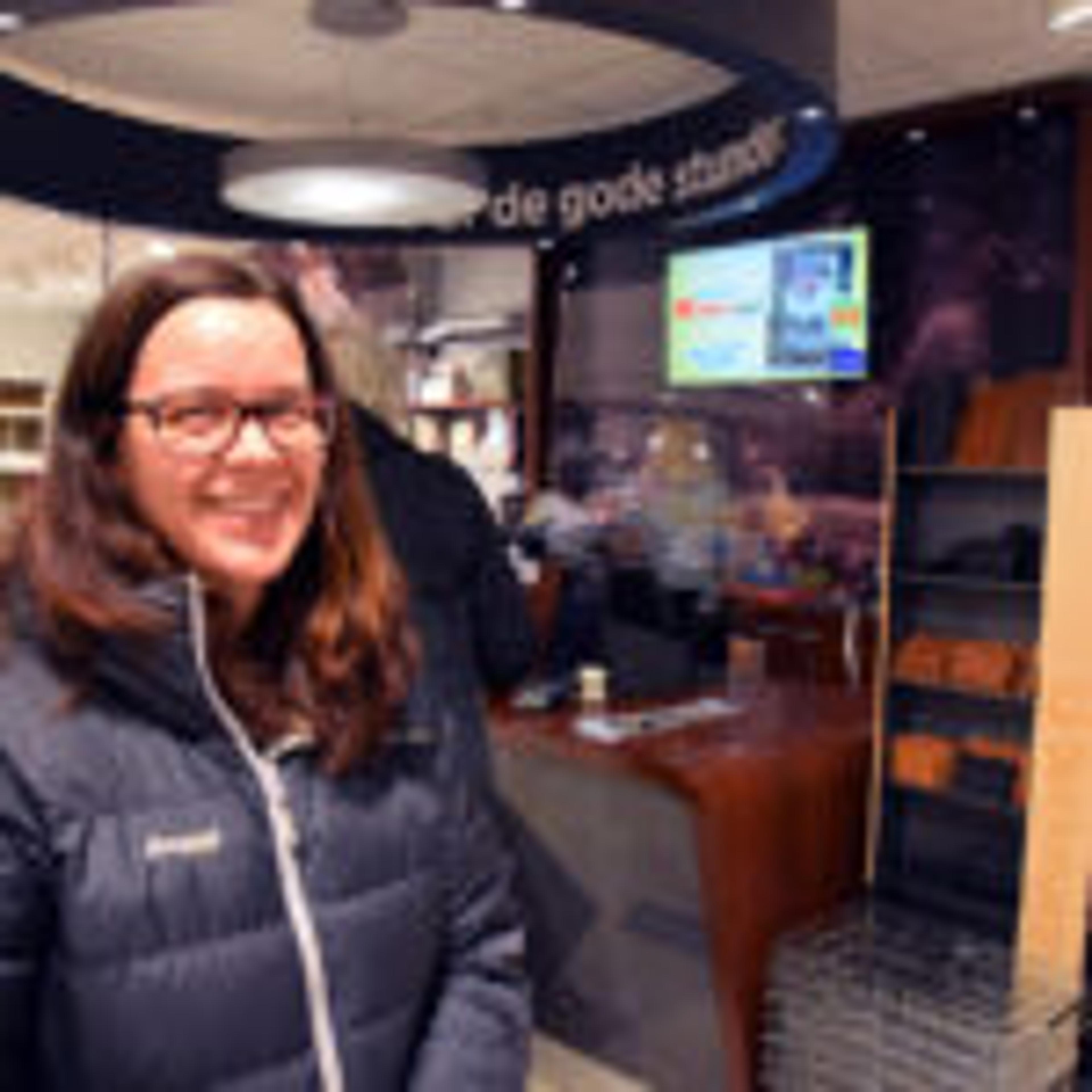RØRÅSTOPPEN SKOLE: Klassekontakt Katrine Løvaas henter gaven til 3. klasse ved Røråstoppen skole. – Vi har noen spill fra før av, så det er supert at vi kan plukke spillene sjøl. Da får vi et flott utvalg av spill i klassen, det kommer til å bli tatt i mot med stor jubel! Foto: Stian Ormestad.