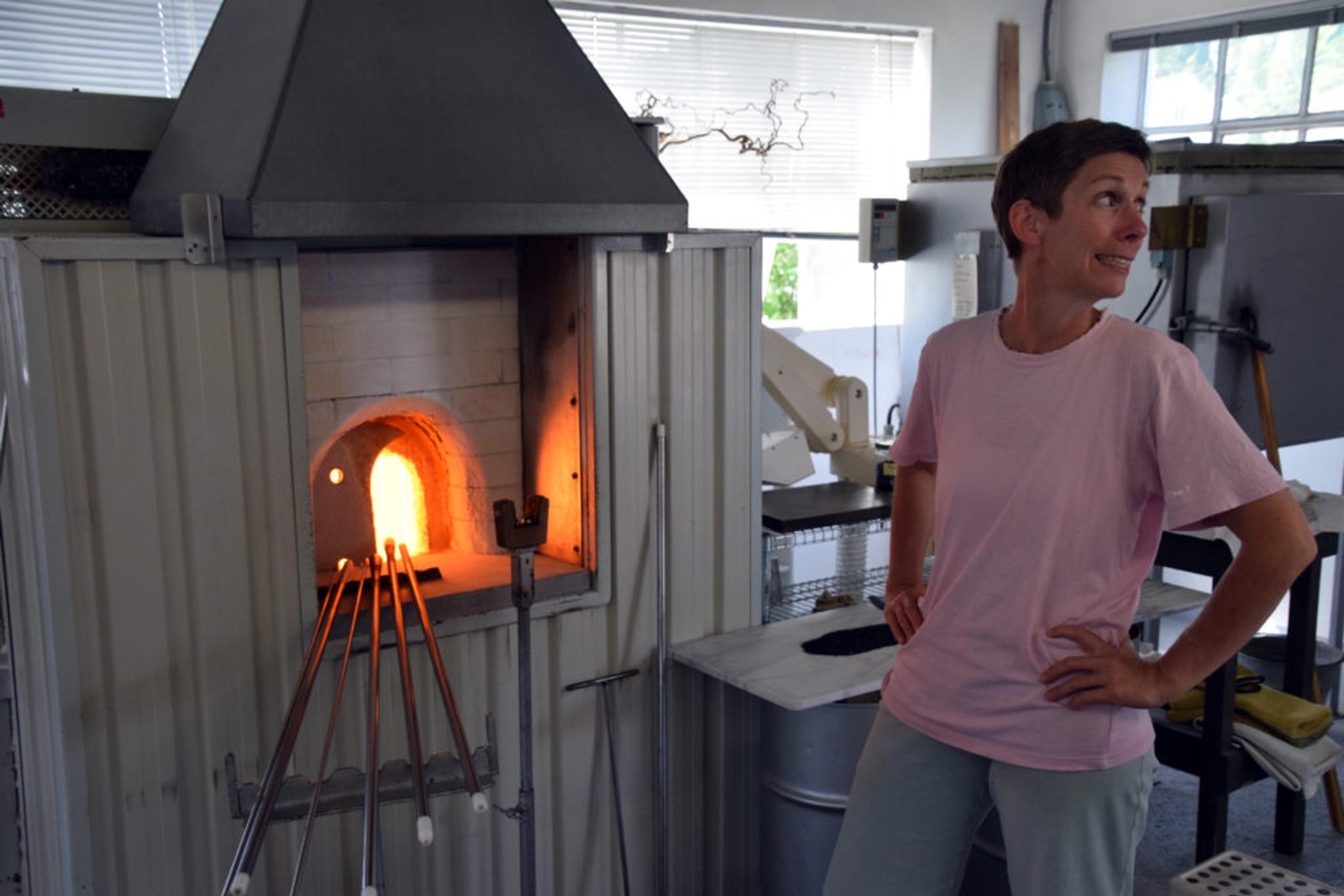 GLASSHYTTA I VIVESTAD: Anne Katrine Munkejord (55) har drivi Glasshytta i Vivestad i snart 25 år. Bildet er fra en større ReAvisa-sak om Anne Ka og kunsthåndtverket for noen år siden. For å produsere er hun helt avhengig av en smelteovn, som koster vanvittig mye å holde i drift med de strømprisene vi har for tida. Foto: Stian Ormestad.